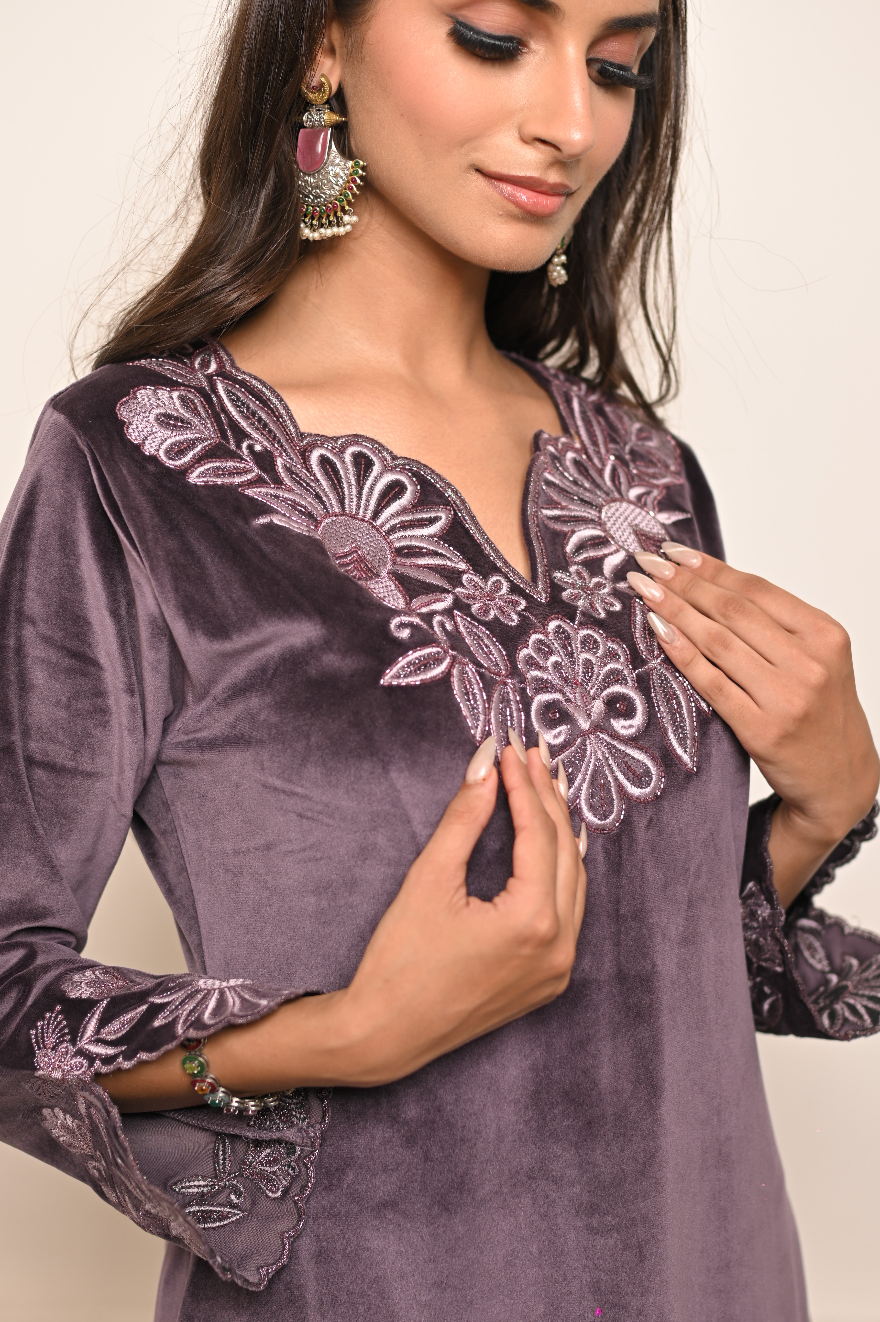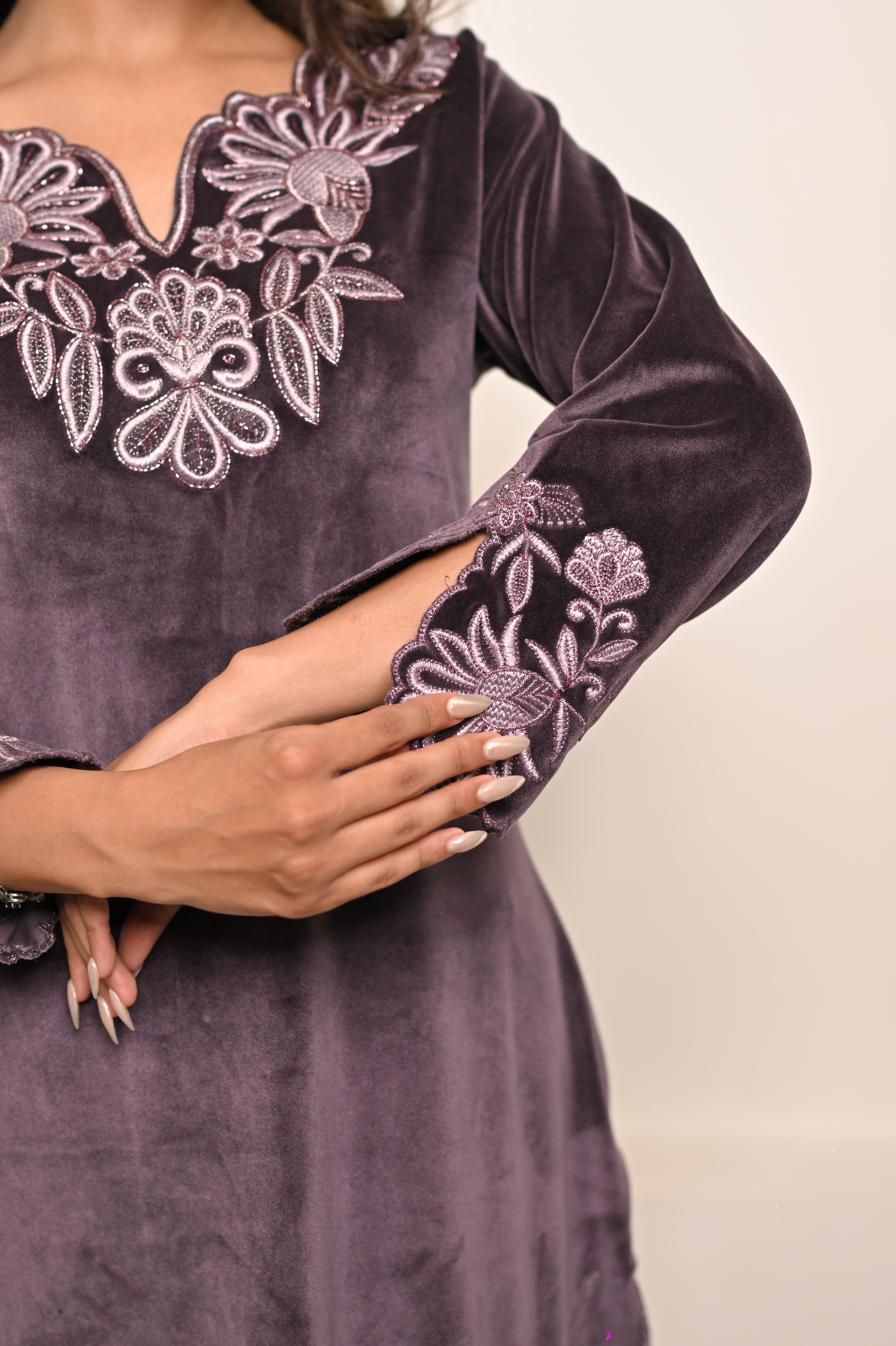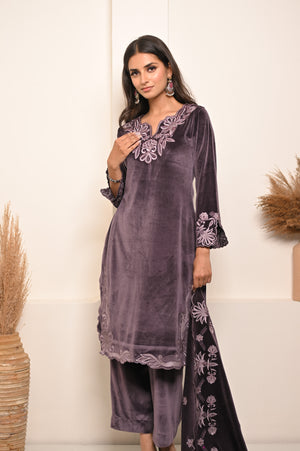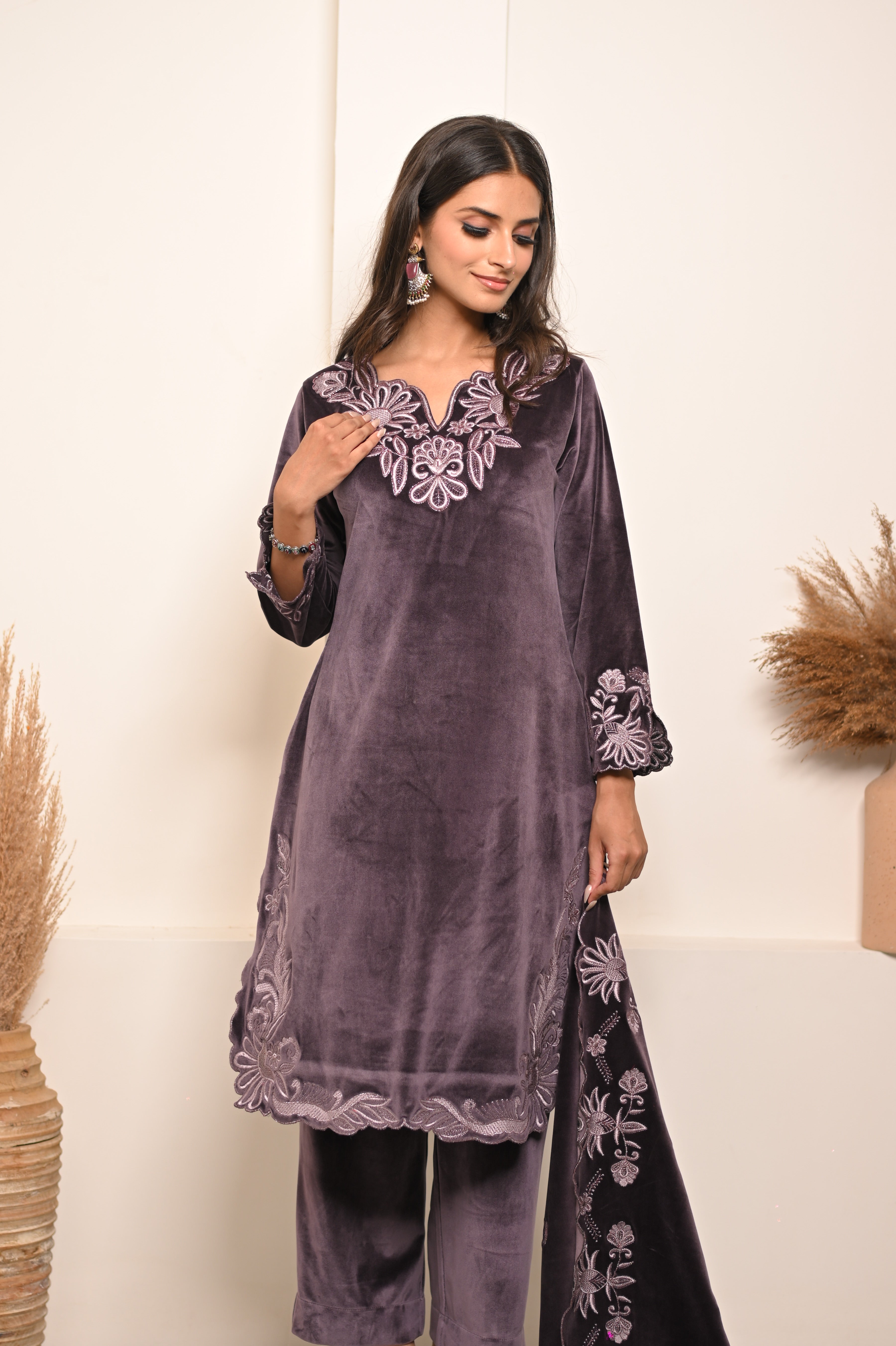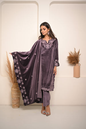 3PC VELVET WITH EBROIDERY ON NECK, PANTS , SLEEVES AND DUPATTA
