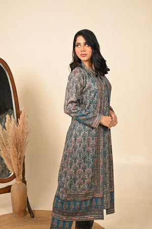 Sophisticated three-piece kurta set in a calming blue shade, featuring delicate traditional prints that evoke timeless elegance. The ensemble includes a flowing kurta, comfortable palazzo pants, and a stylish printed jacket for layered charm. Perfectly balanced for festive occasions or chic winter gatherings, this set blends classic craftsmanship with contemporary flair to deliver a refined, statement look.