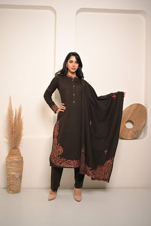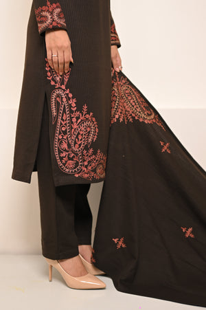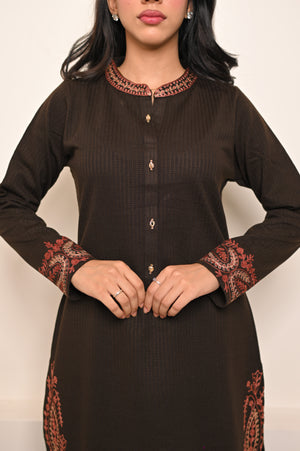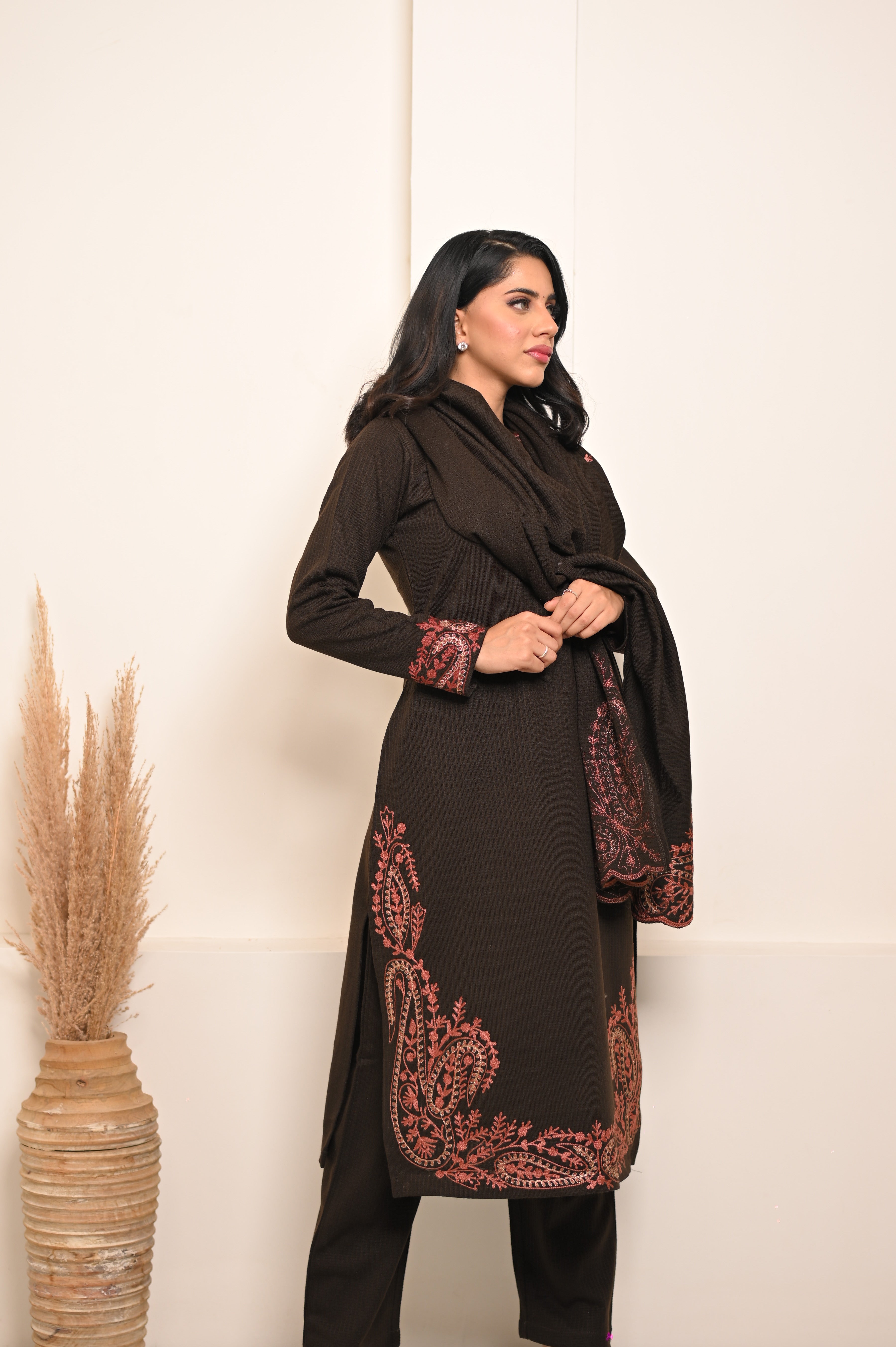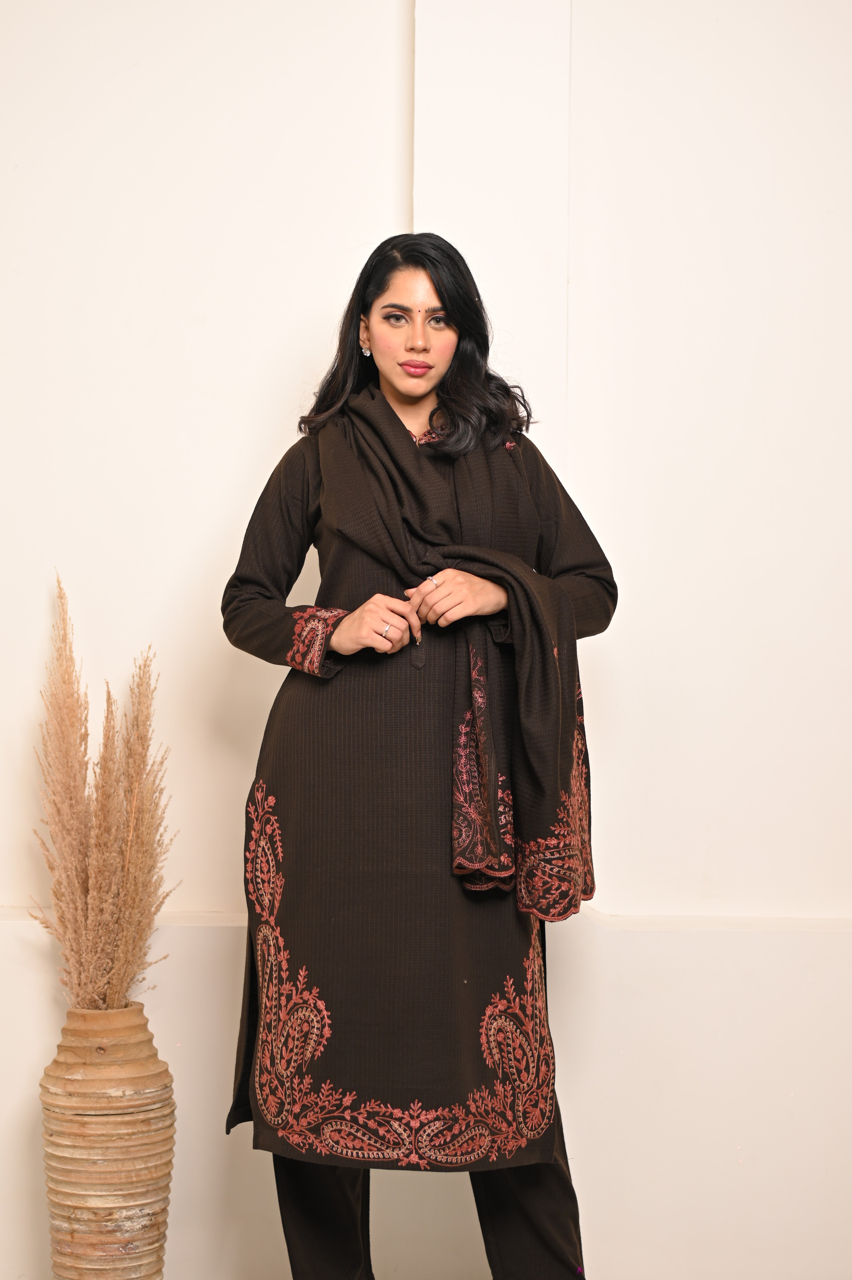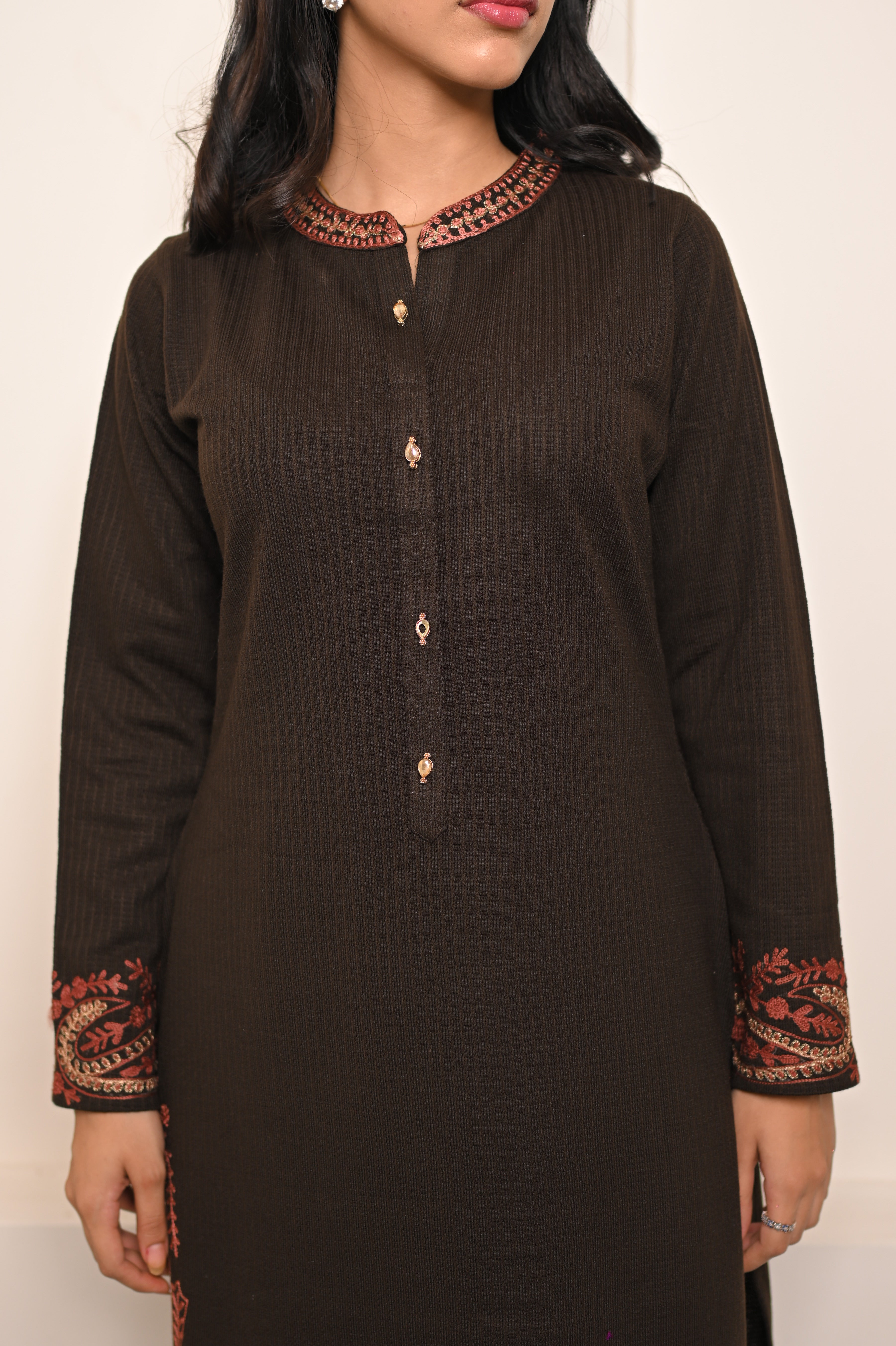 Earthy tones meet elegant design in this knitted brown suit set, featuring delicate embroidery for a refined and comfortable statement.