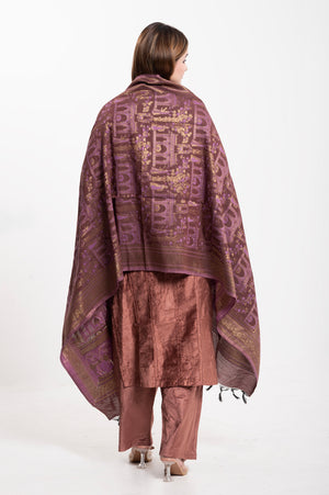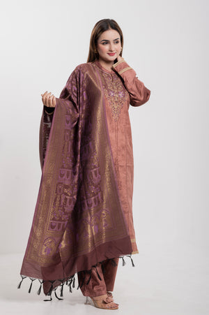 The matching trousers ensure comfort with style, while the highlight of the set is the deep maroon jacquard dupatta featuring rich woven patterns in golden and purple, finished with elegant tassels for a royal touch.