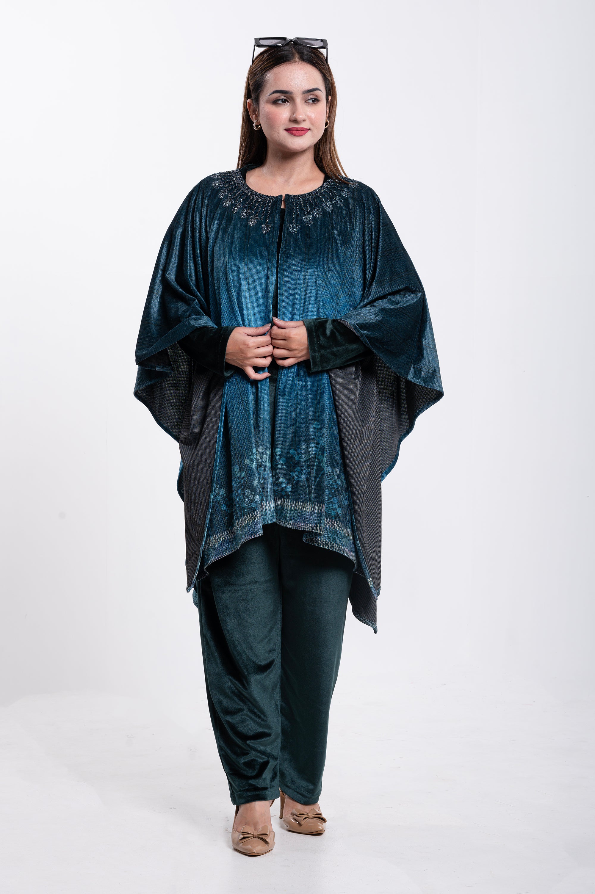 Step into effortless elegance with our Elegant Teal Velvet Poncho Set, designed for women who love comfort with style. Crafted from premium-quality velvet, this outfit features a luxuriously soft poncho with a relaxed silhouette, enhanced by delicate embroidery around the neckline and subtle floral accents at the hem. The matching straight-fit velvet trousers add a touch of sophistication, making it perfect for both casual gatherings and semi-formal occasions.