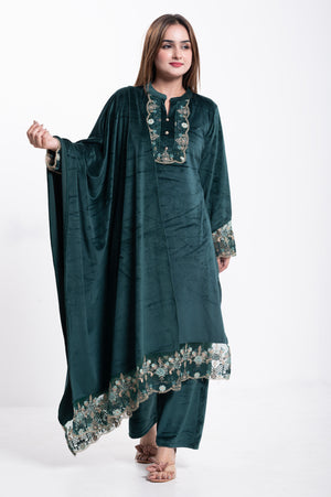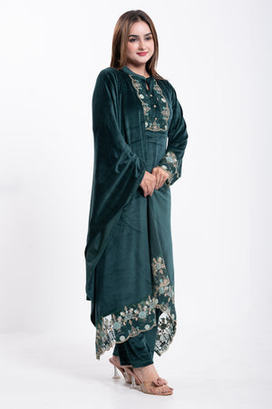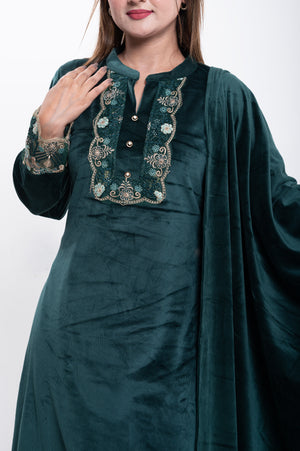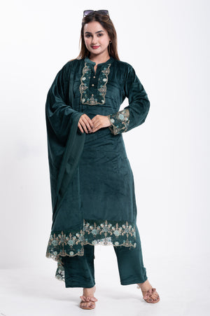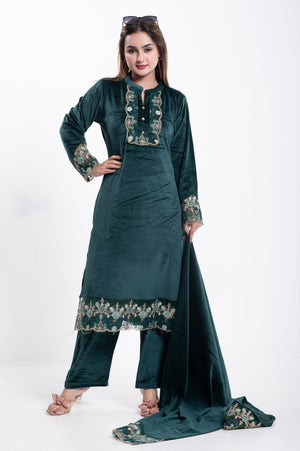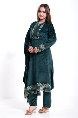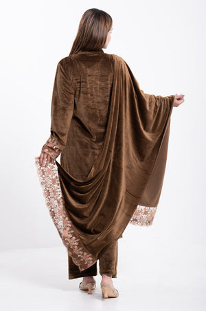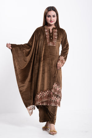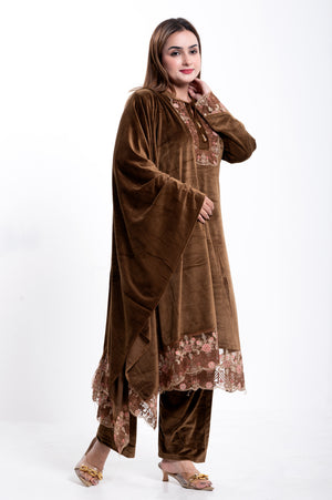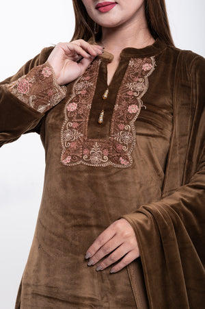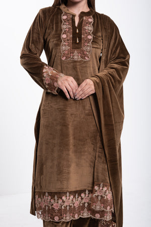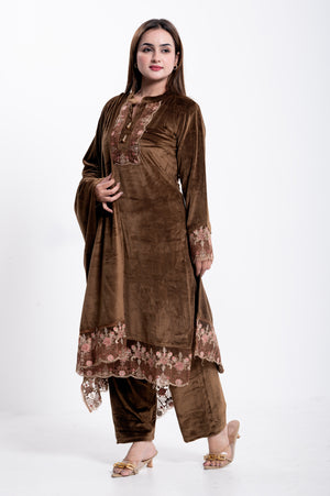 Step into timeless elegance with this Brown Velvet Embroidered Suit Set, designed to make you shine at festive gatherings, weddings, and special occasions. Crafted from premium quality velvet, this three-piece set includes a beautifully tailored kurta, straight pants, and a matching dupatta.