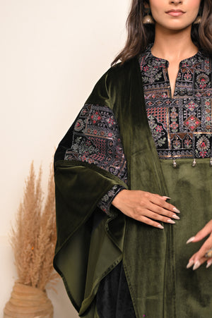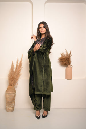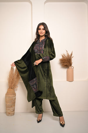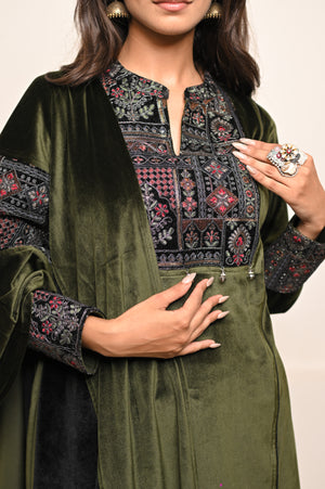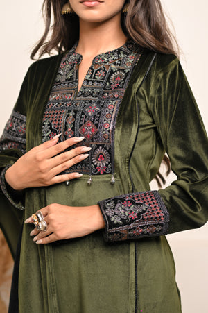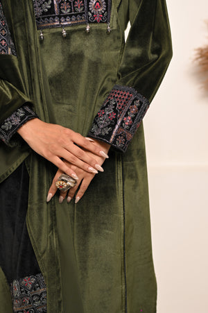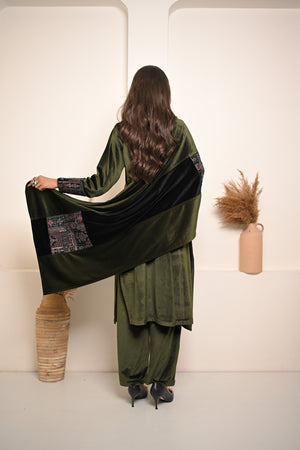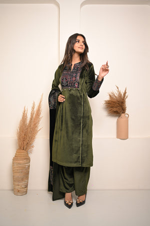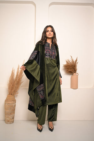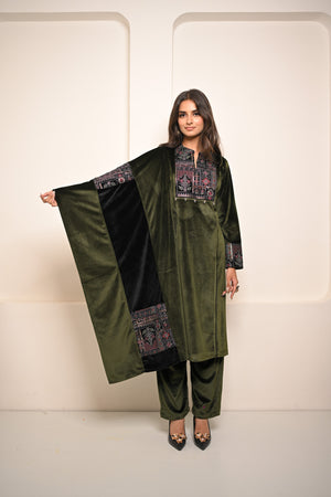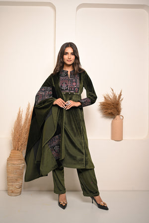 Embrace the richness of green with this three-piece velvet ensemble, featuring a subtly embroidered neckline for a touch of refined luxury.