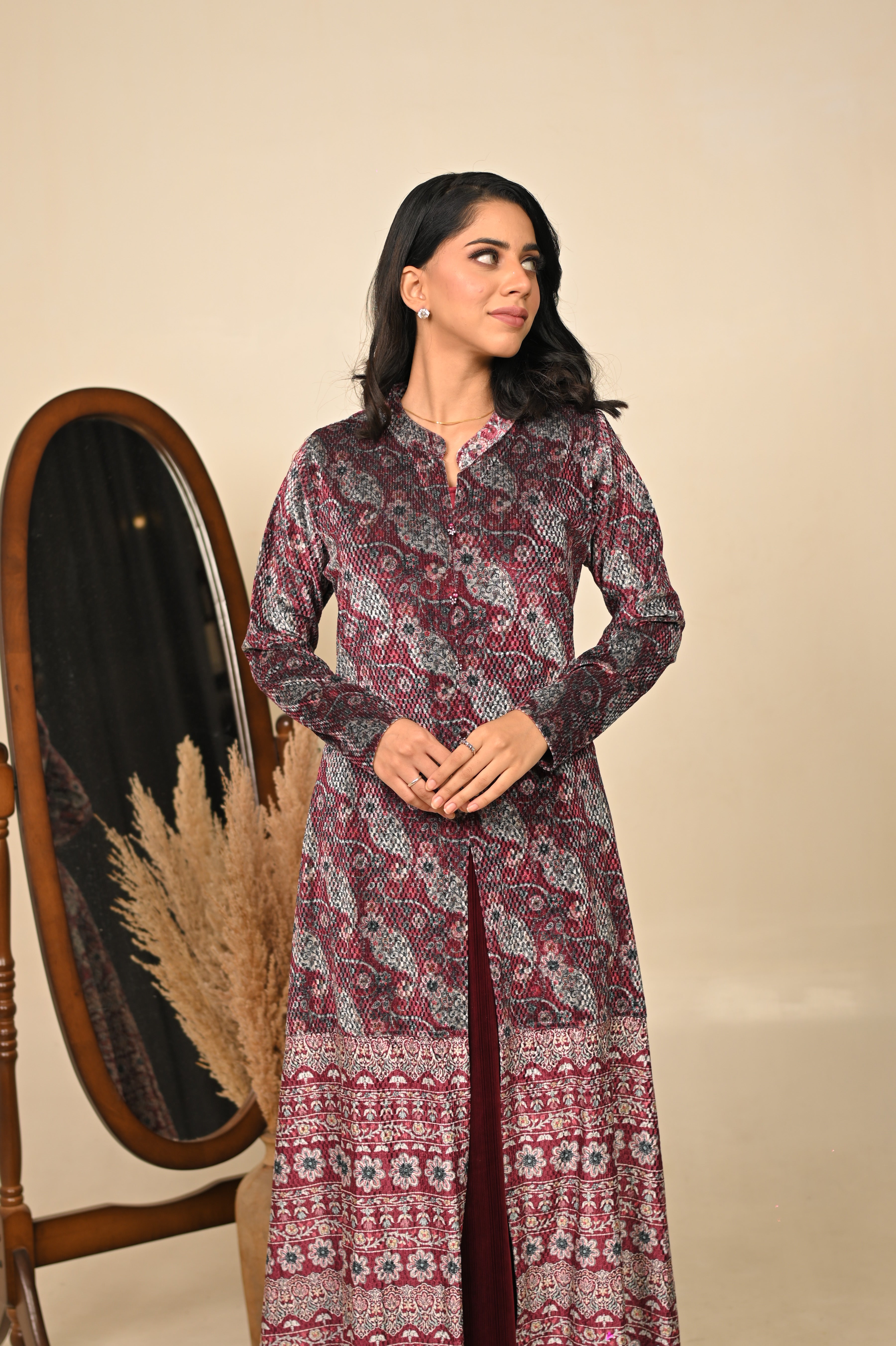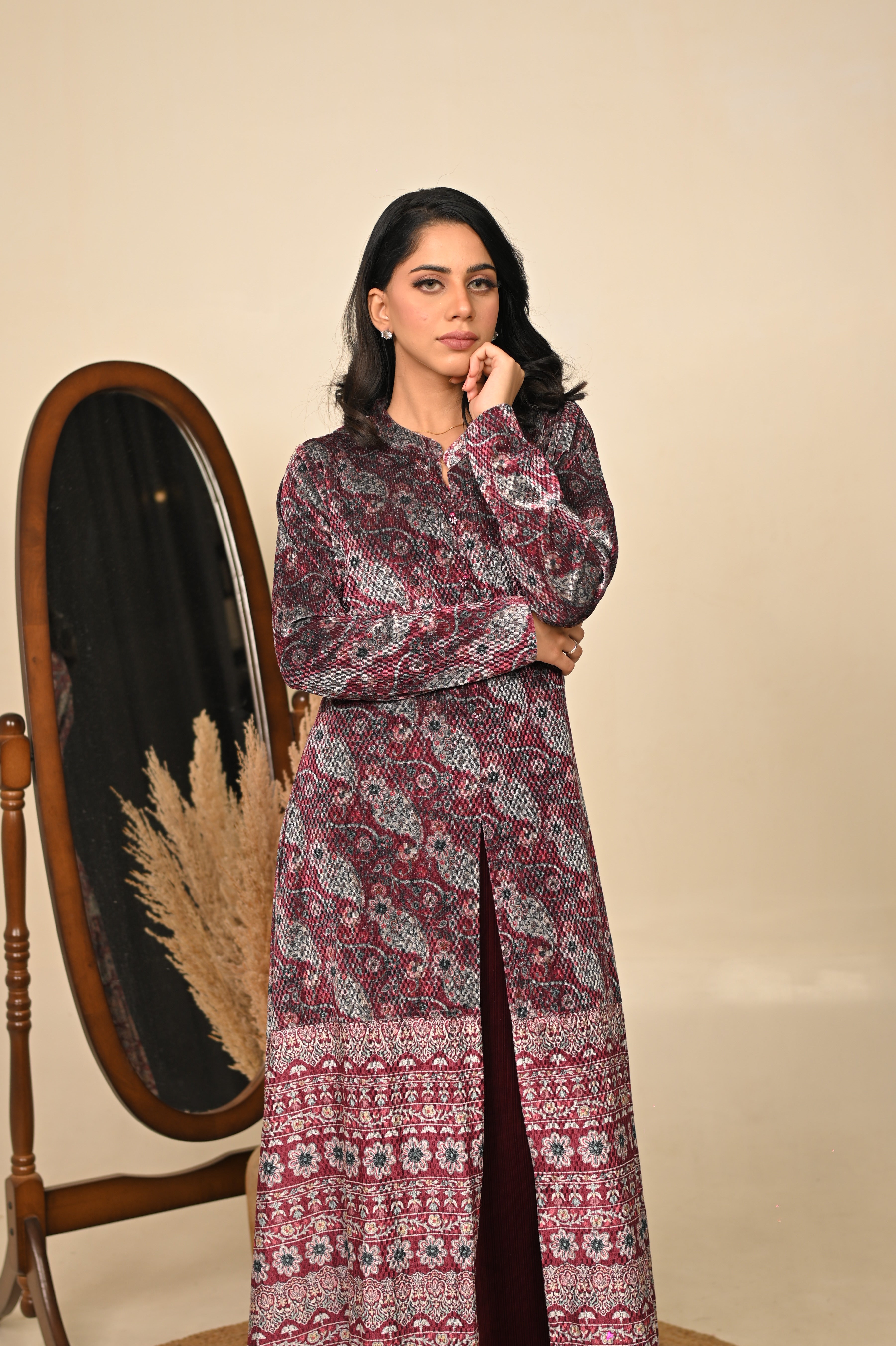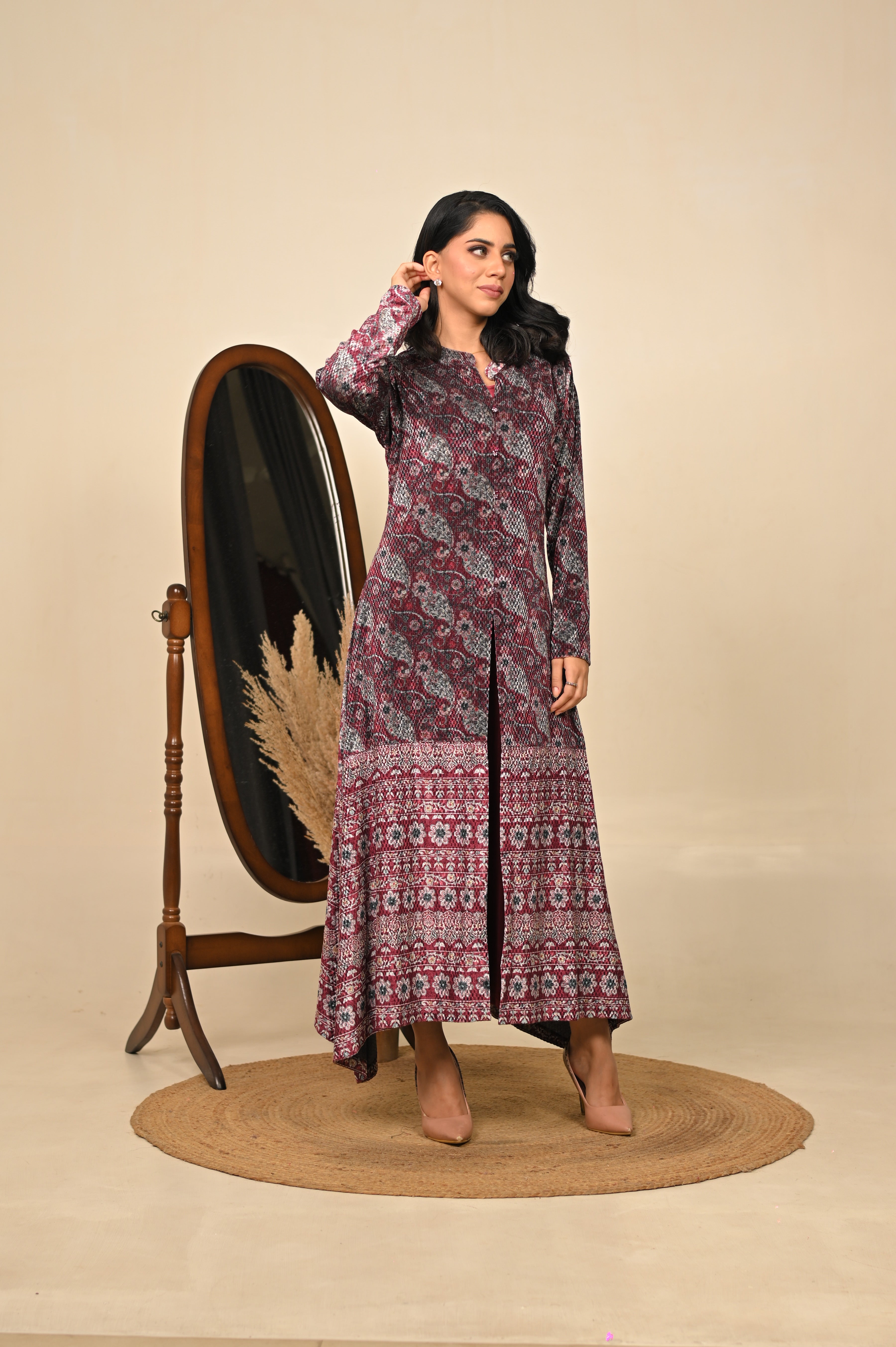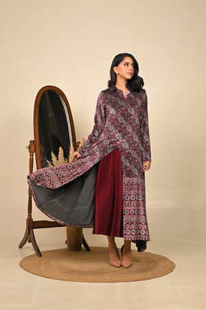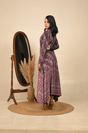 Wrapped in the regal hue of jamuni (purple), this woolen printed gown blends winter warmth with festive elegance. Its soft fabric drapes beautifully, while the intricate prints add a touch of artistry — making it a perfect choice for celebratory evenings and graceful winter gatherings.