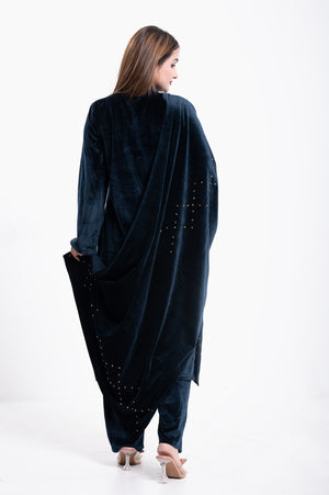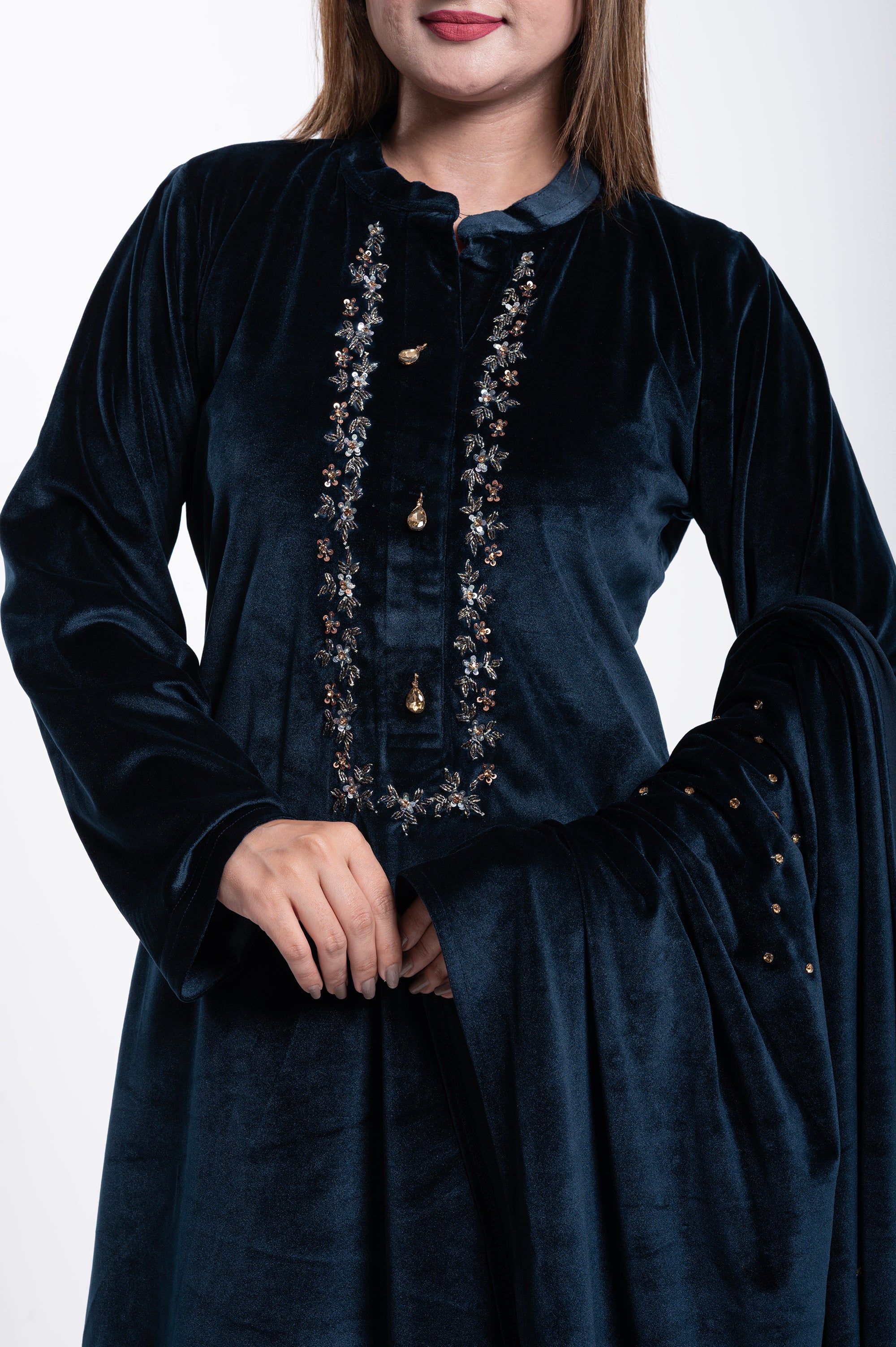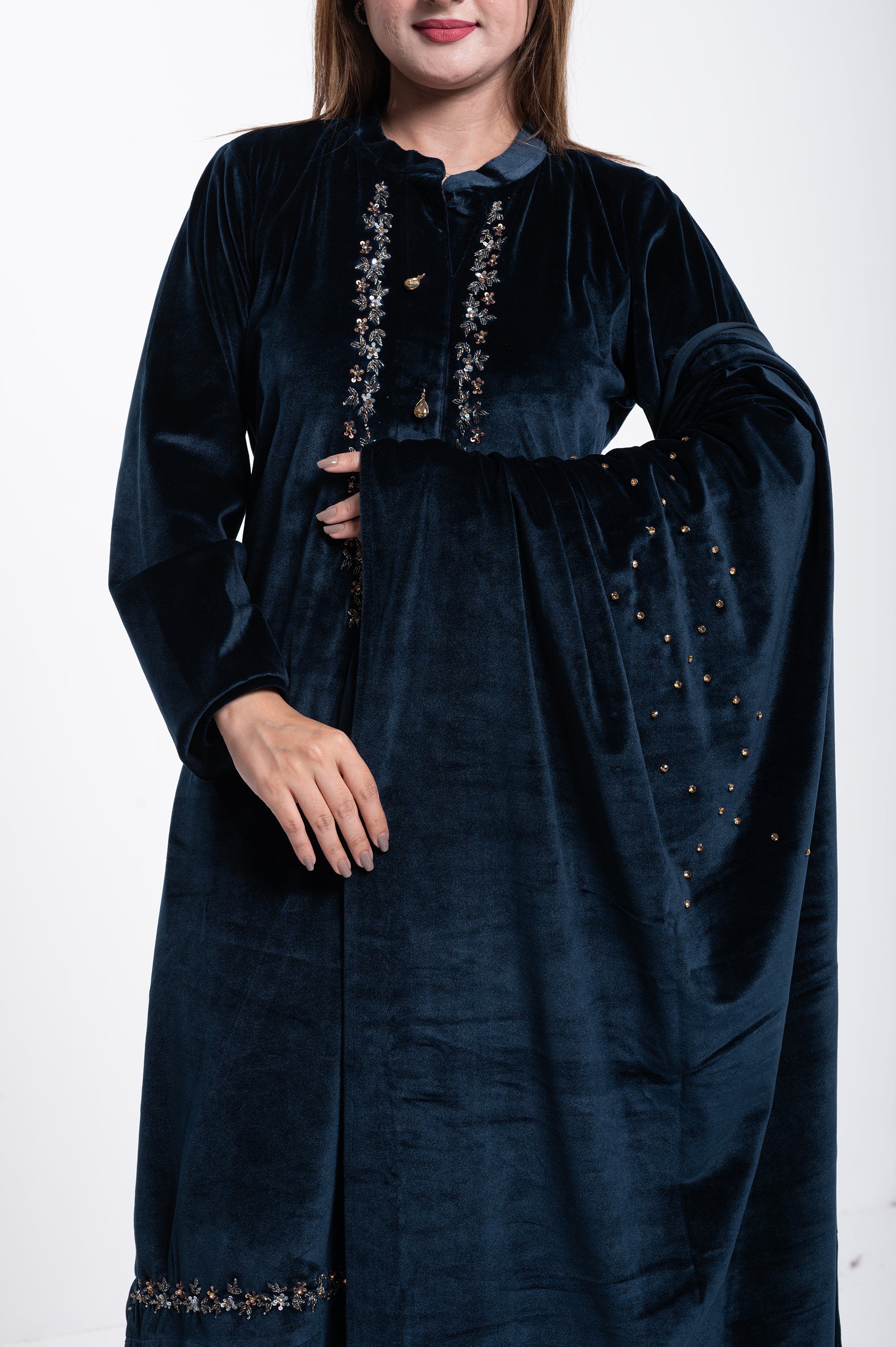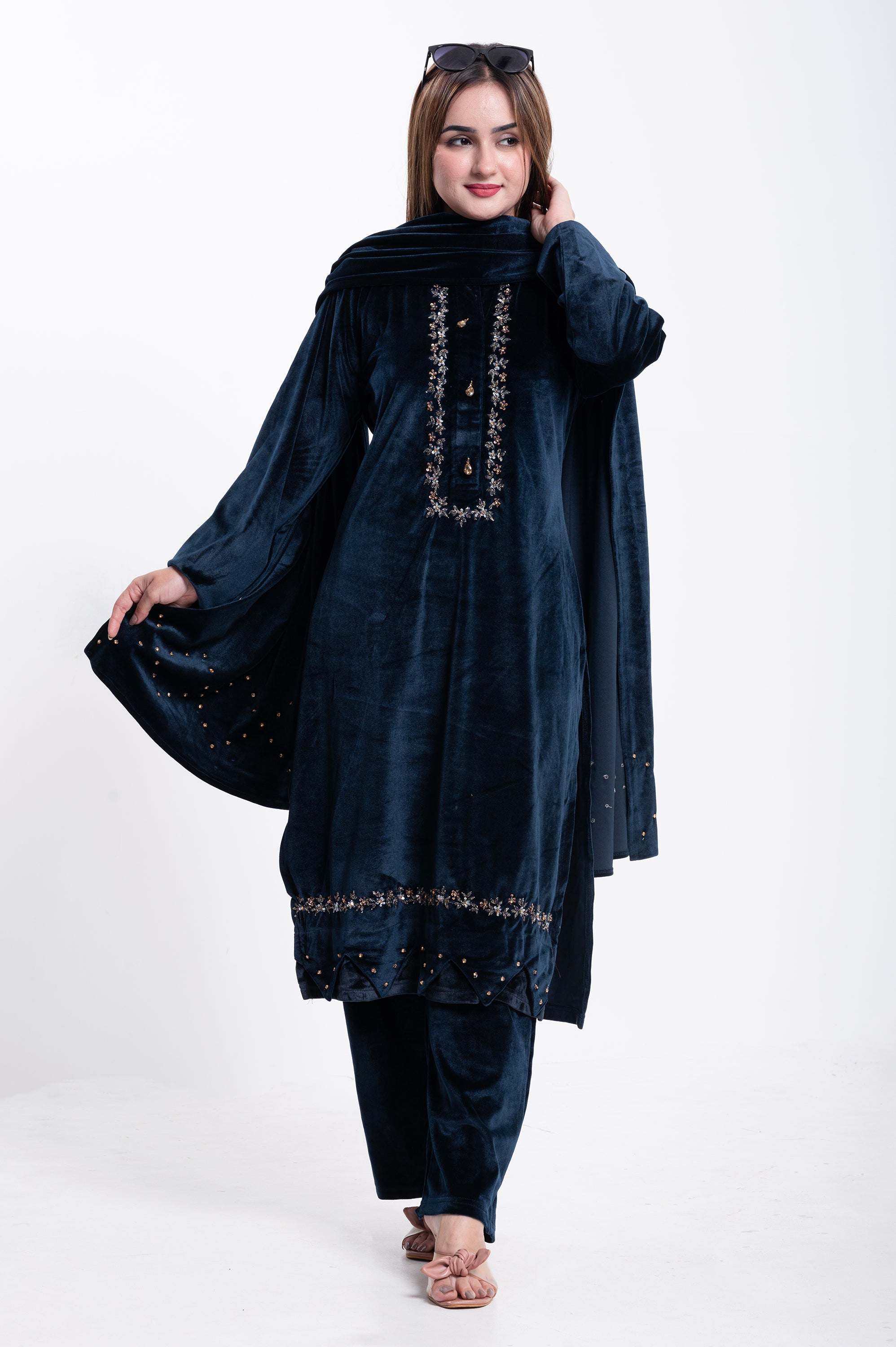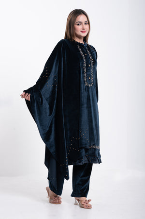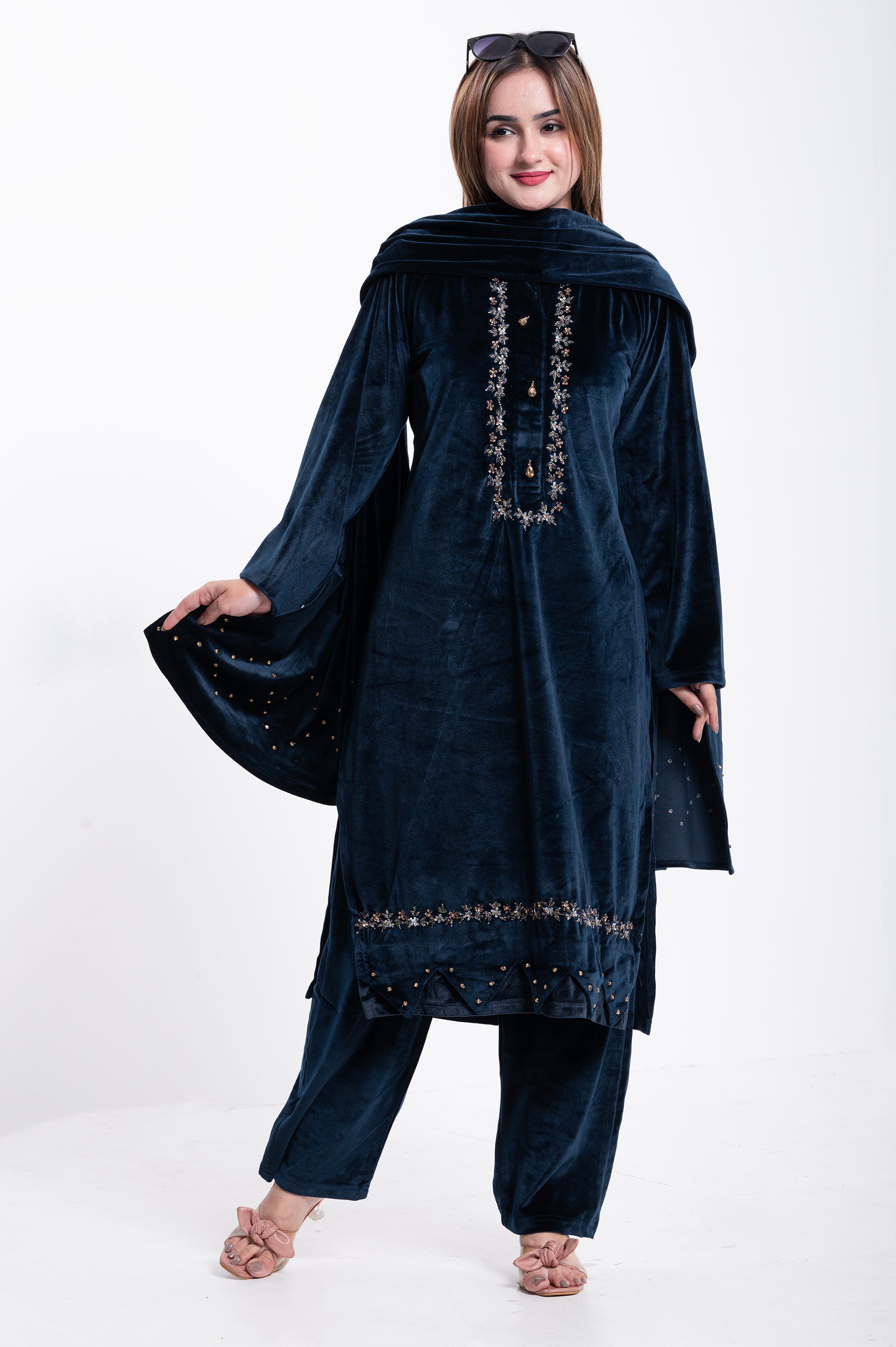Step into elegance with our Midnight Blue Velvet Embroidered Suit Set, designed to bring out your timeless charm. Crafted from premium velvet fabric, this outfit offers a luxurious feel with a graceful drape. The kurta is beautifully adorned with delicate floral embroidery along the neckline and hem, enhanced by shimmering embellishments for a touch of festive sparkle. Paired with matching straight-fit trousers and a dupatta featuring subtle beadwork, this ensemble is perfect for weddings, festive celebrations, and special evening gatherings.