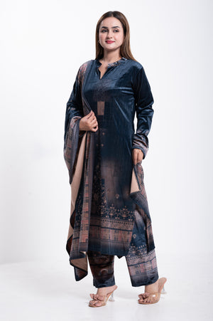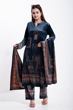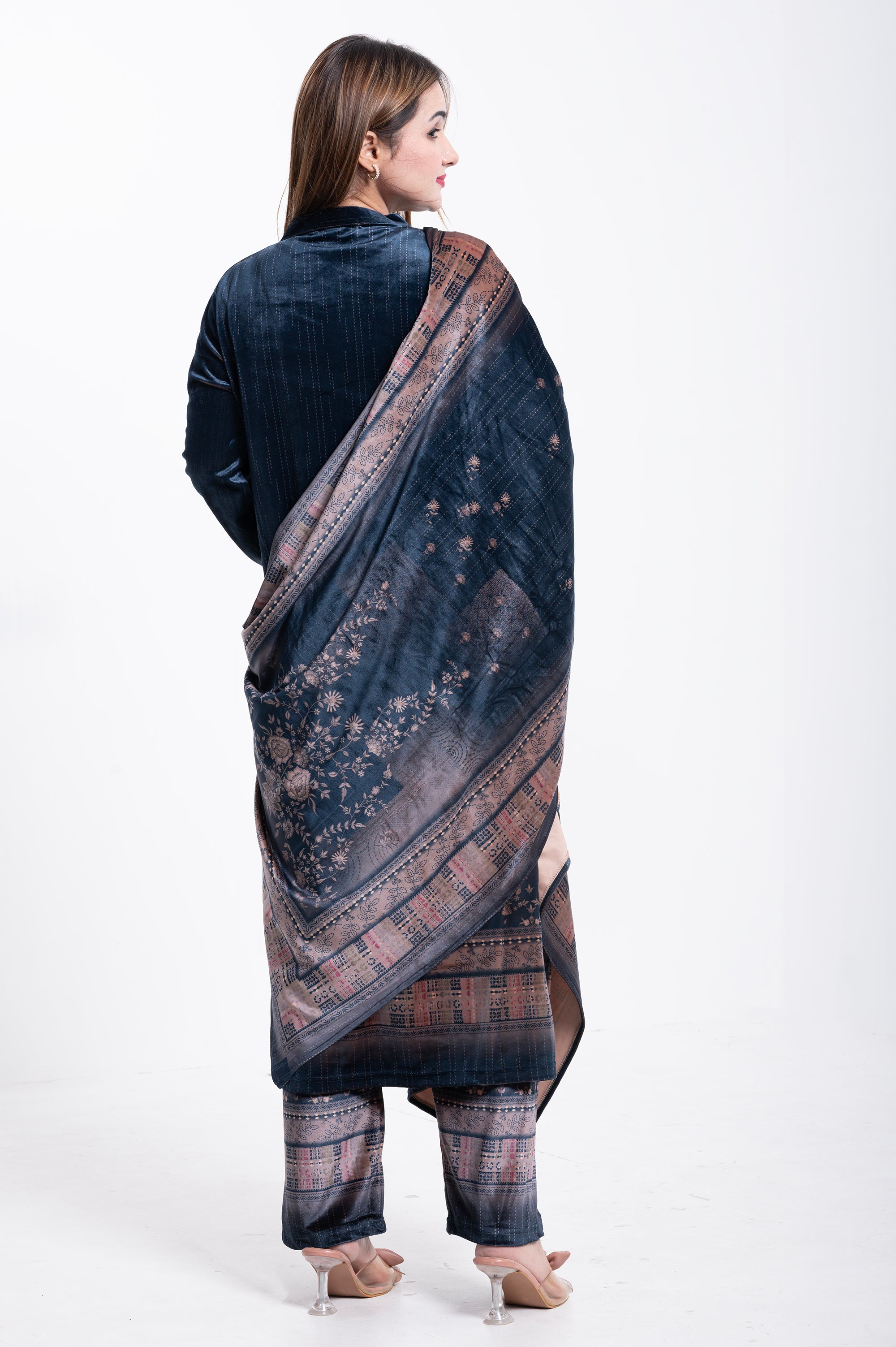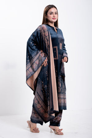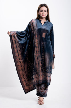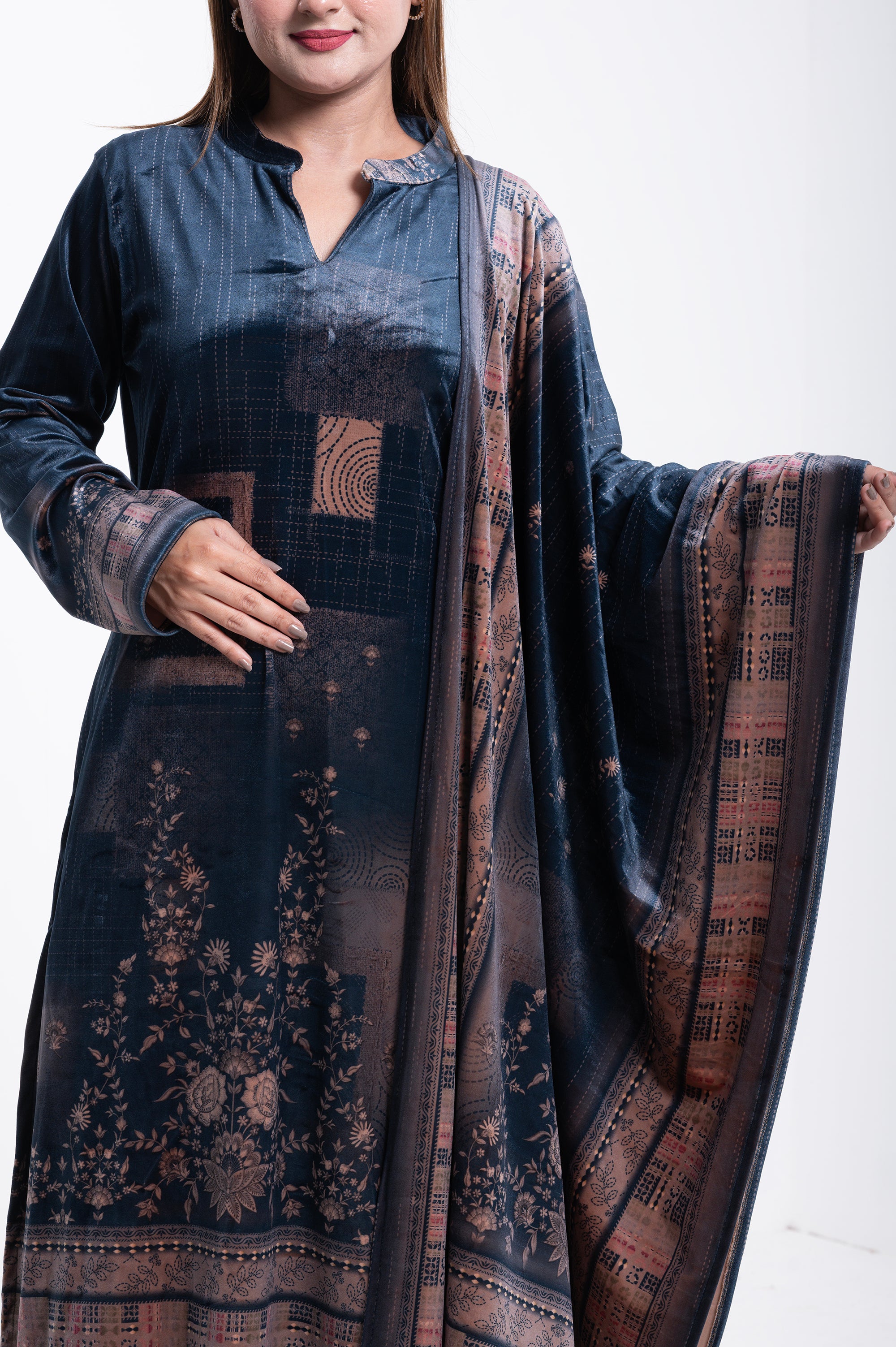 Step into timeless sophistication with our Midnight Elegance Printed 3-Piece Suit, crafted from premium soft fabric for all-day comfort and style. This graceful ensemble features a beautifully designed long kurta in deep navy tones with intricate geometric and floral patterns, paired with matching trousers for a seamless look. The outfit is completed with a flowing printed dupatta, showcasing delicate motifs and a classic border that enhances its traditional charm.