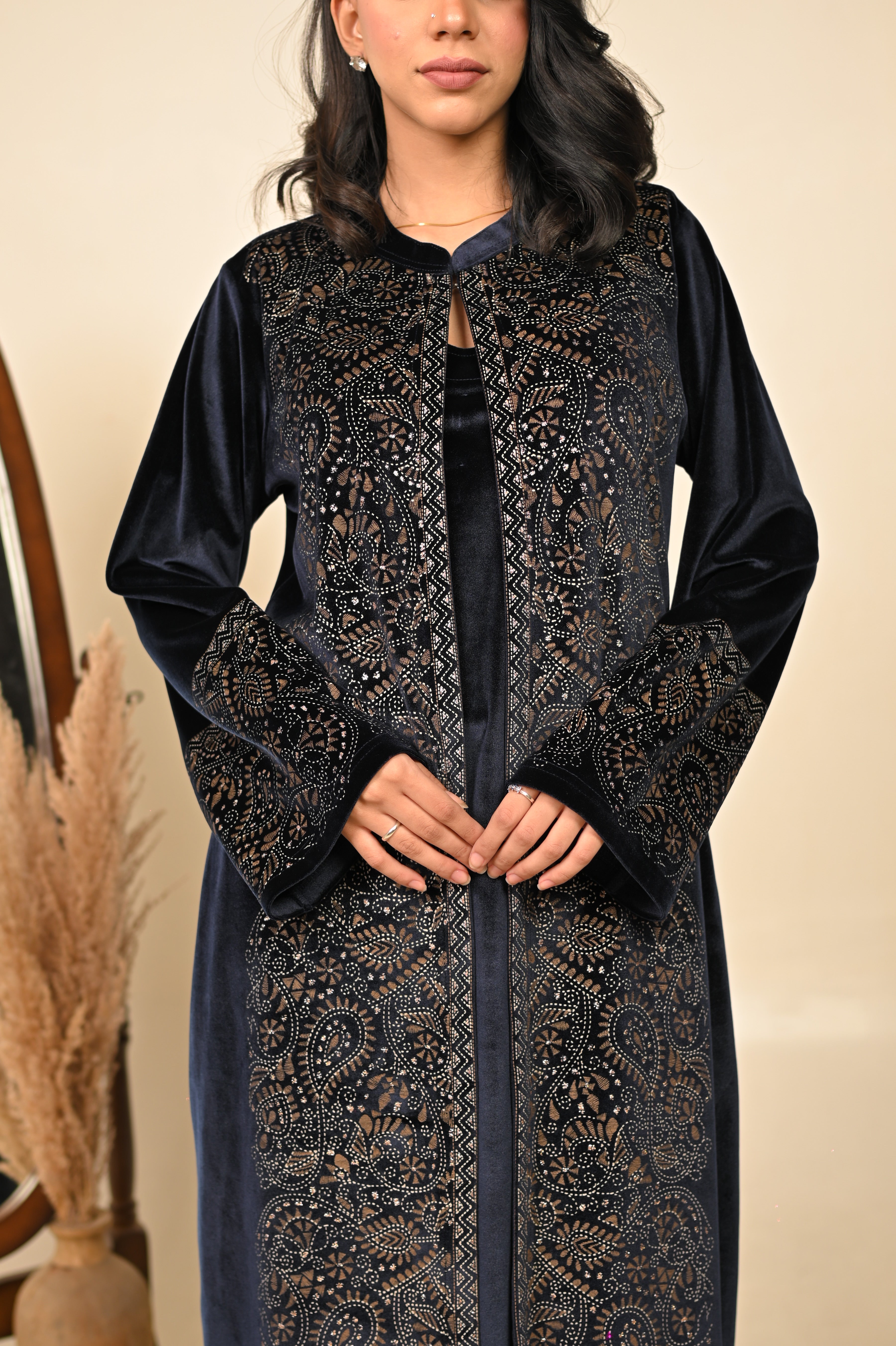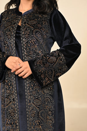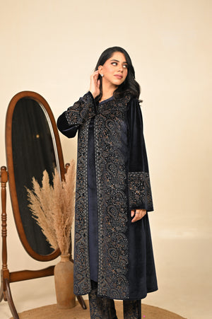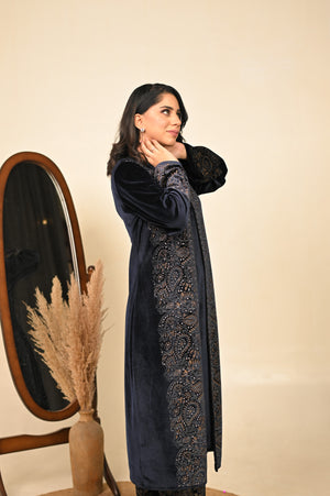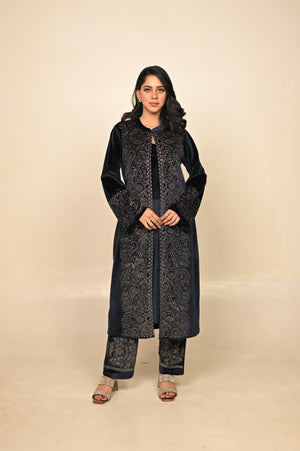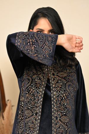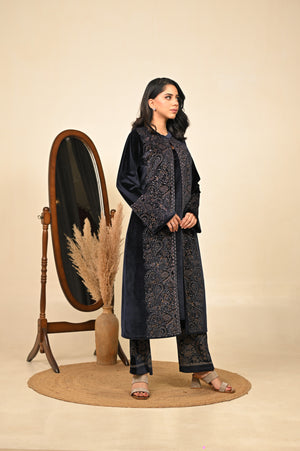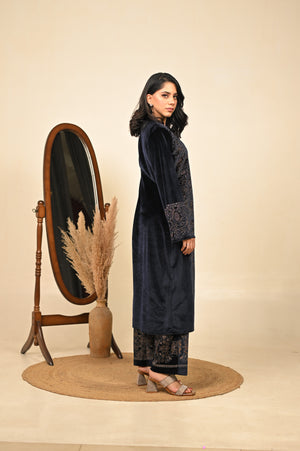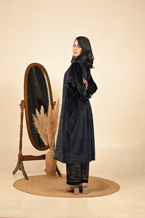 Step into the season of elegance with our navy blue 3-piece coord set, where timeless tradition meets winter sophistication. Crafted in a luxurious fabric blend, this ensemble features a flowing kurta, wide-legged palazzo pants, and a structured jacket that adds warmth without compromising style. The deep midnight hue evokes regal charm, making it a perfect pick for festive evenings, winter weddings, or intimate gatherings.