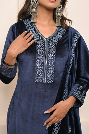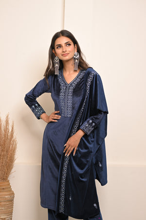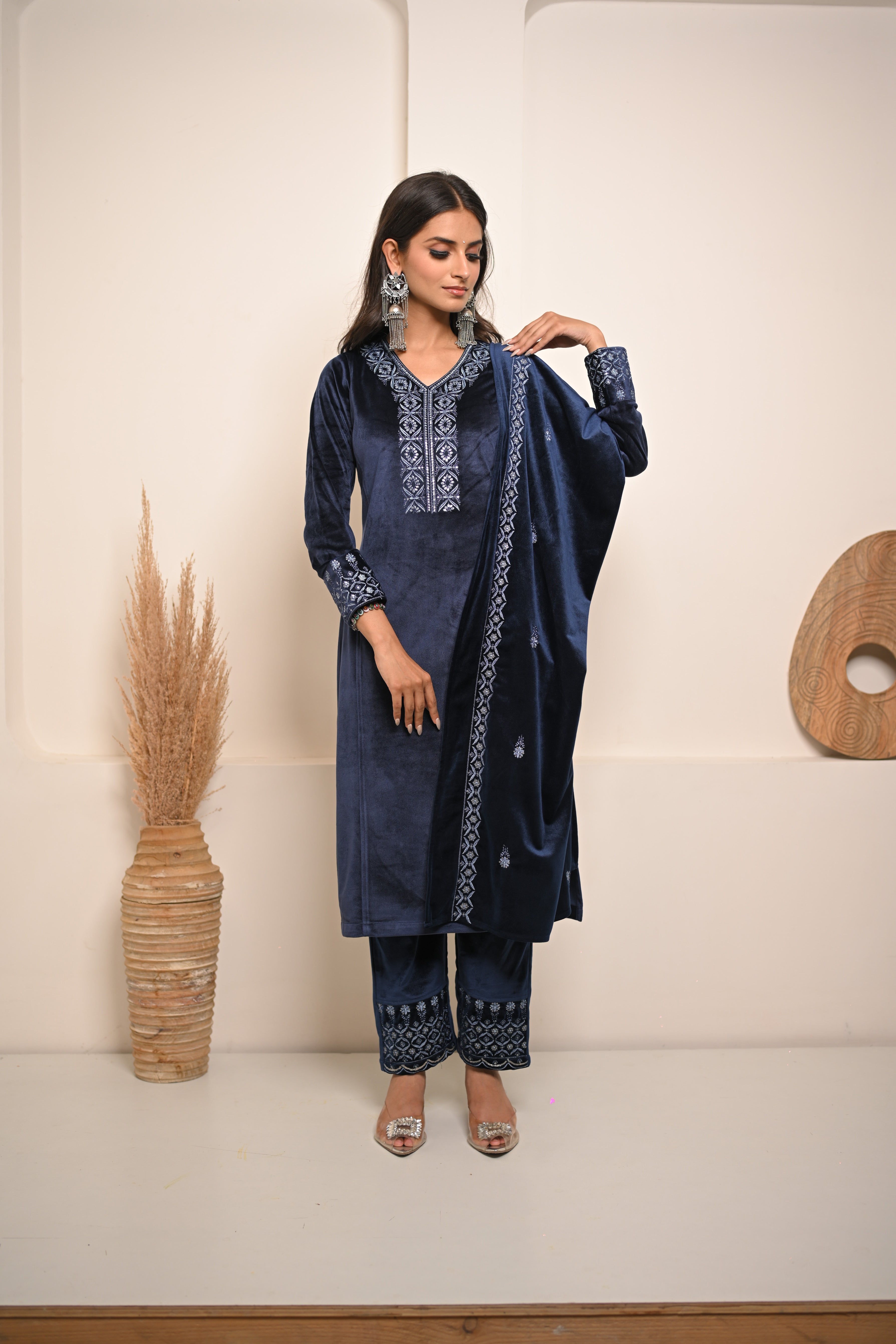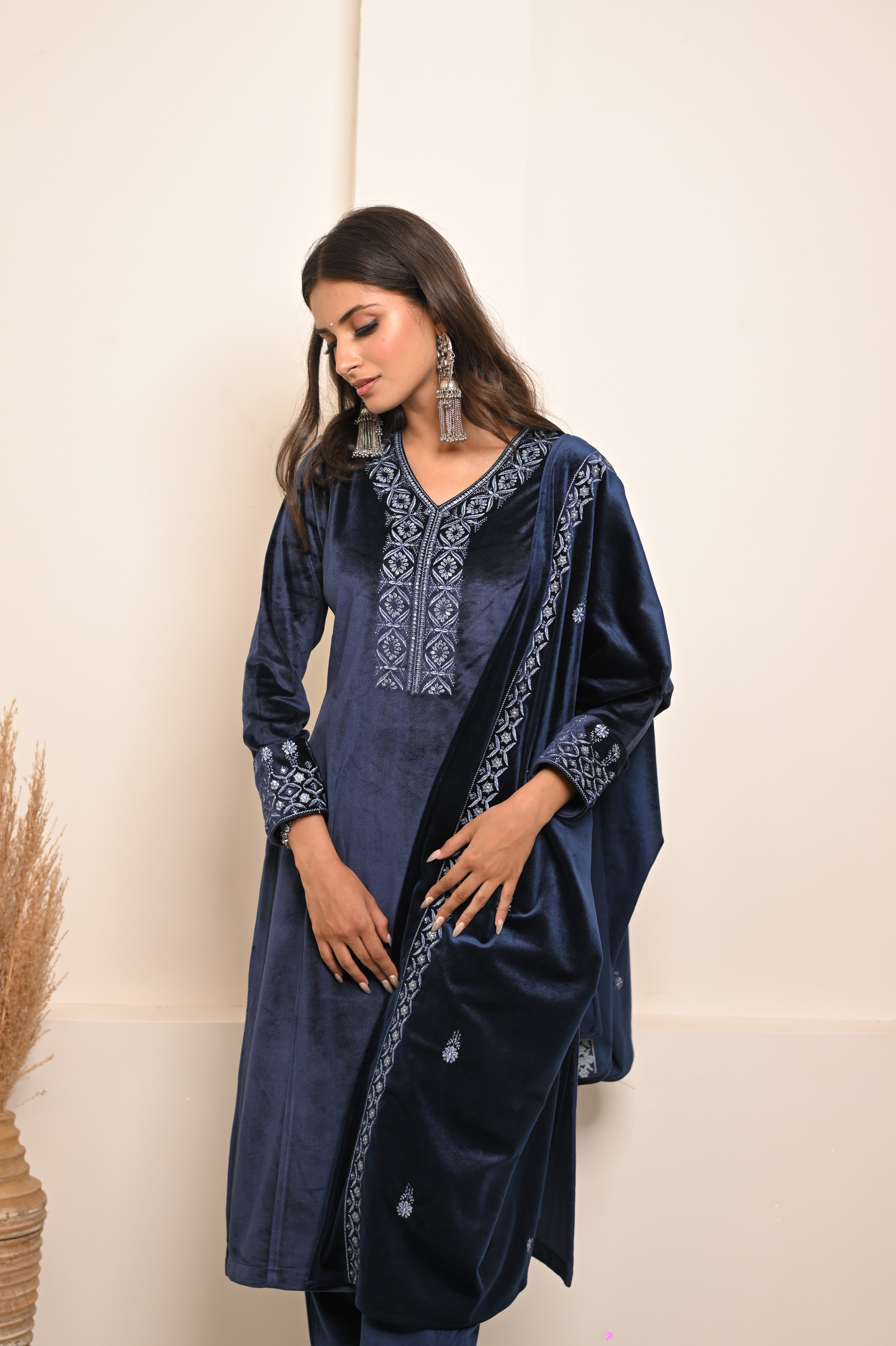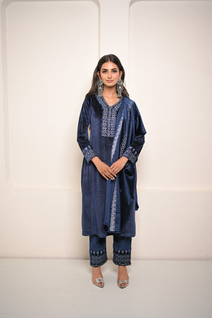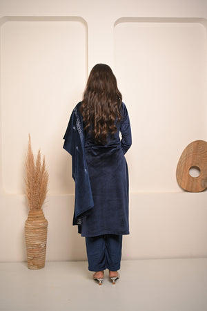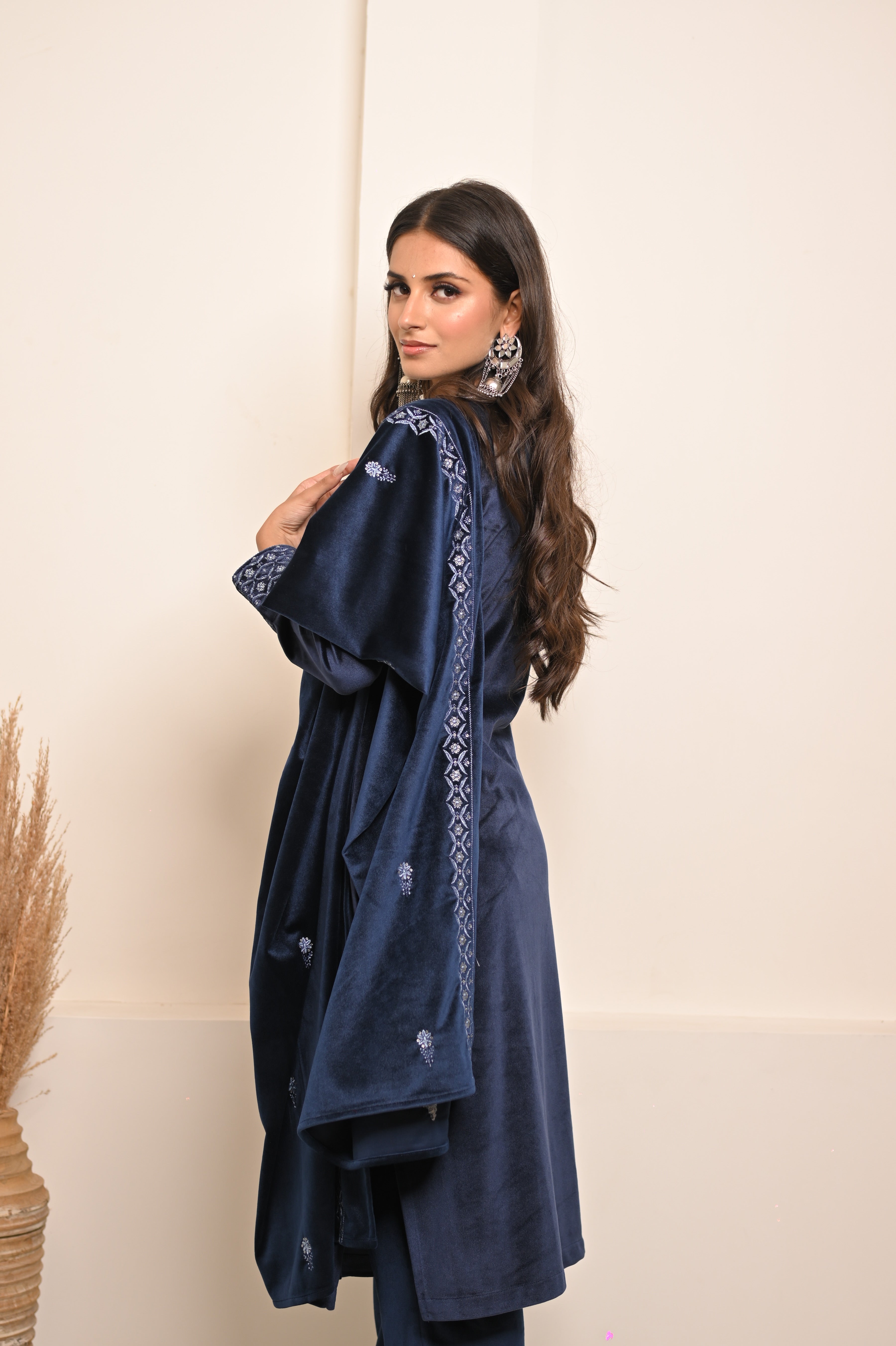 3PC VELVET WITH EBROIDERY ON NECK, PANTS , SLEEVES AND DUPATTA