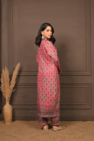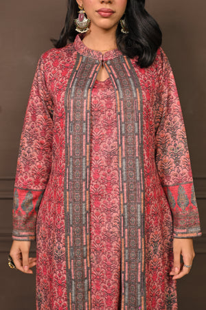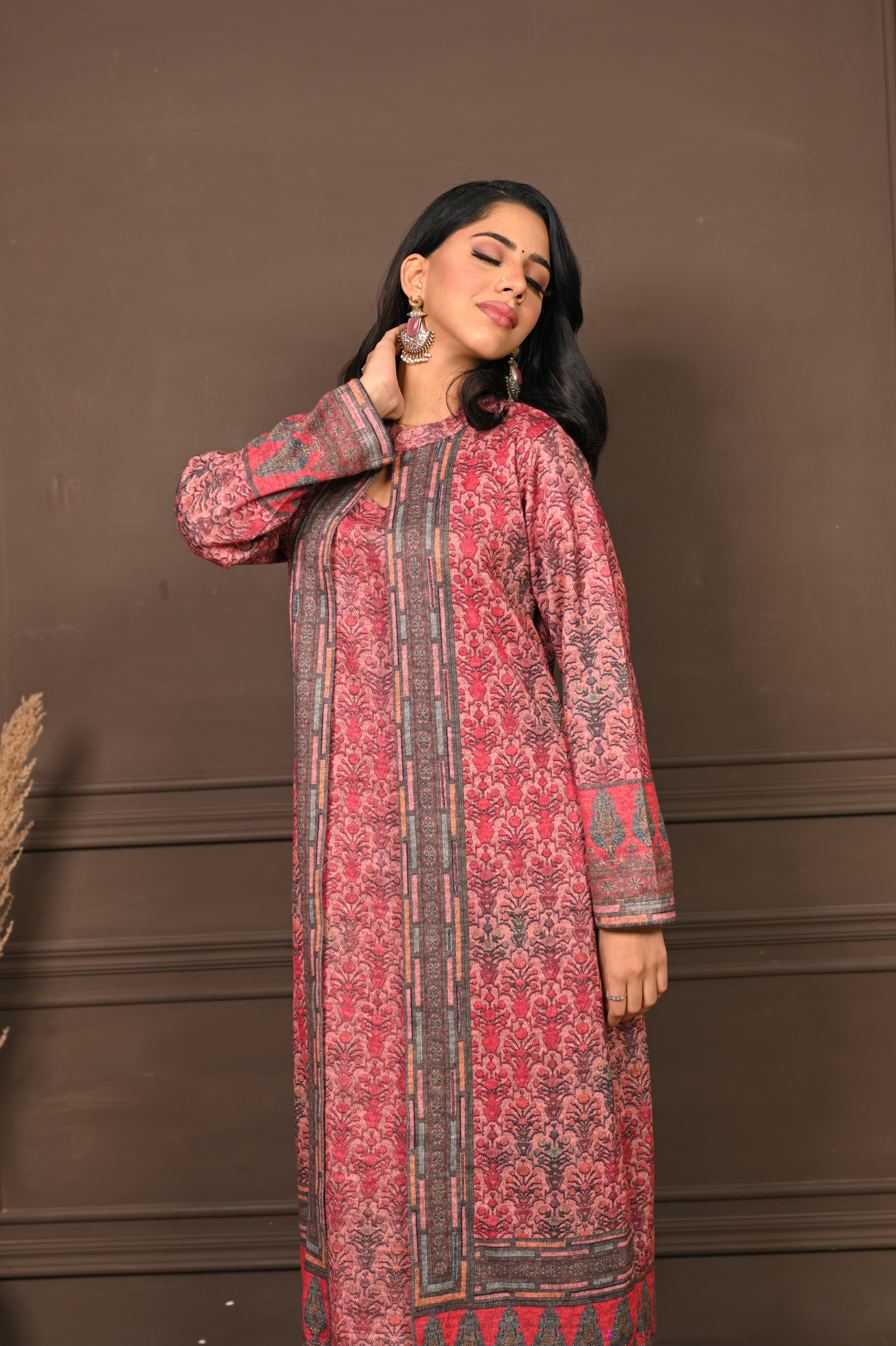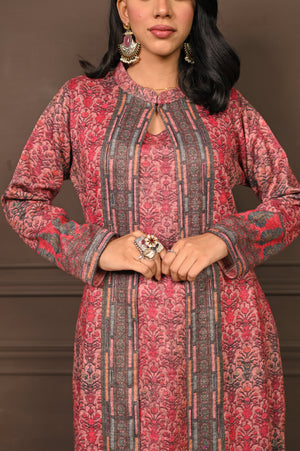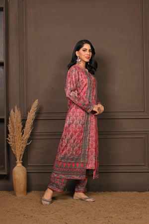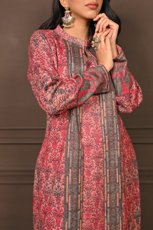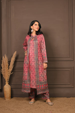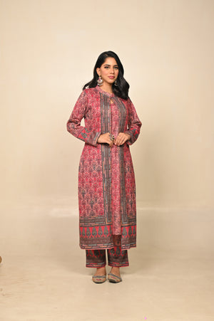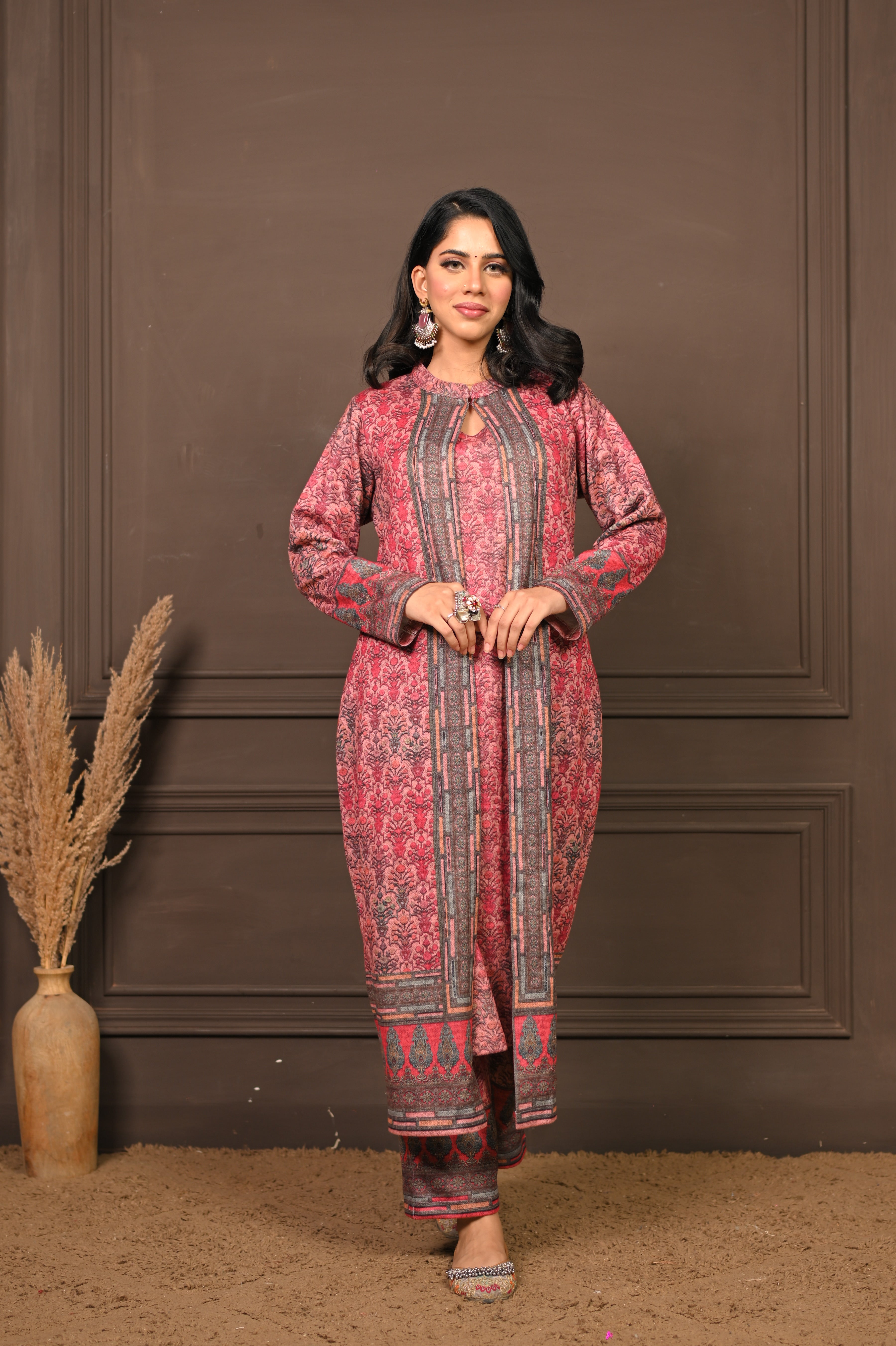 Enchanting three-piece kurta set in a soft pink hue, adorned with intricate prints that blend traditional artistry with contemporary style. Featuring a flowing kurta, comfortable palazzo pants, and a coordinating printed jacket, this ensemble offers layered sophistication and effortless grace. Ideal for festive celebrations or elegant winter gatherings, it’s a perfect balance of comfort and refined charm