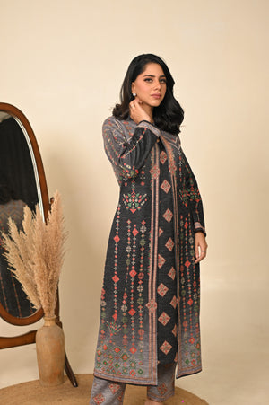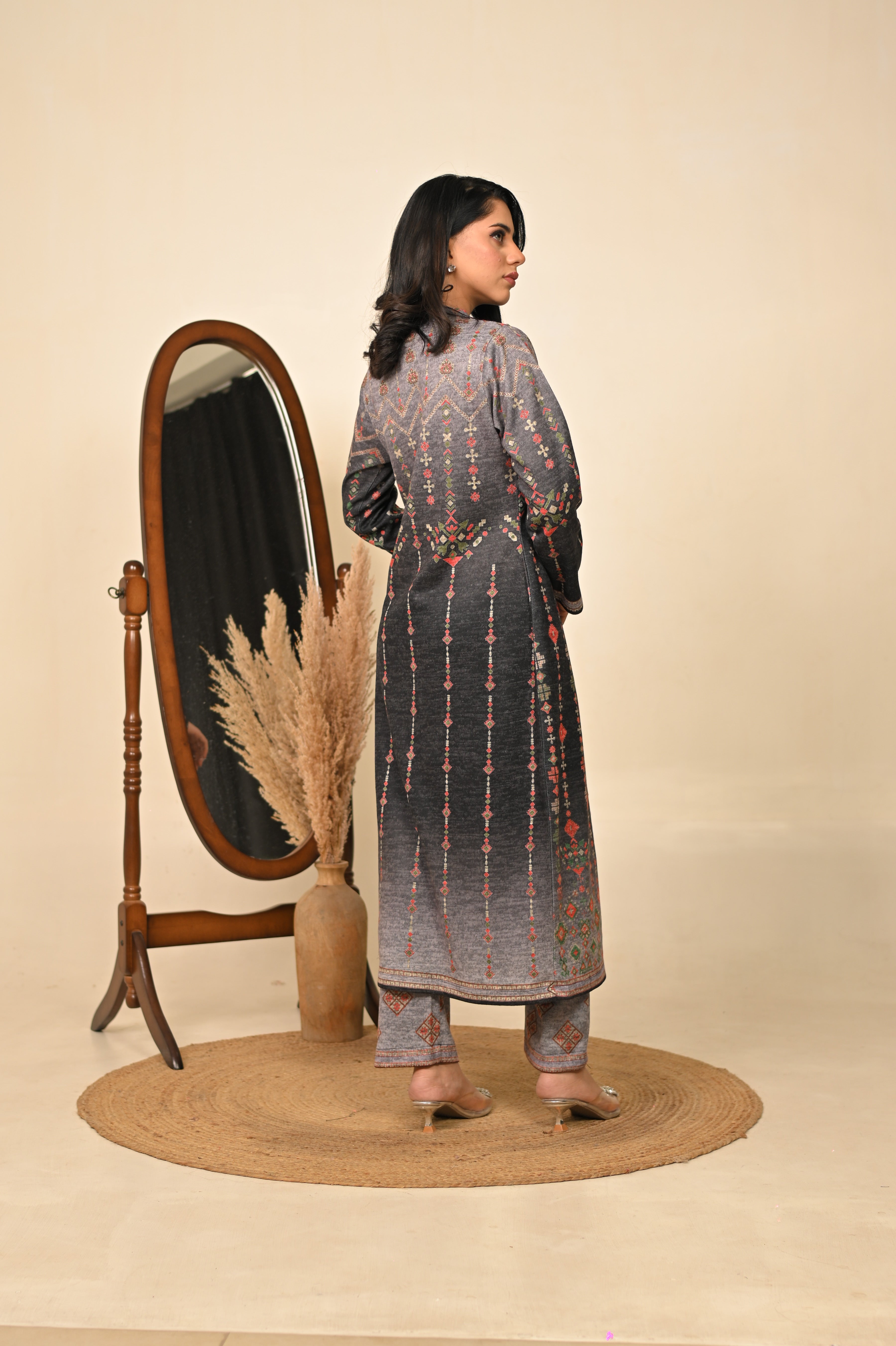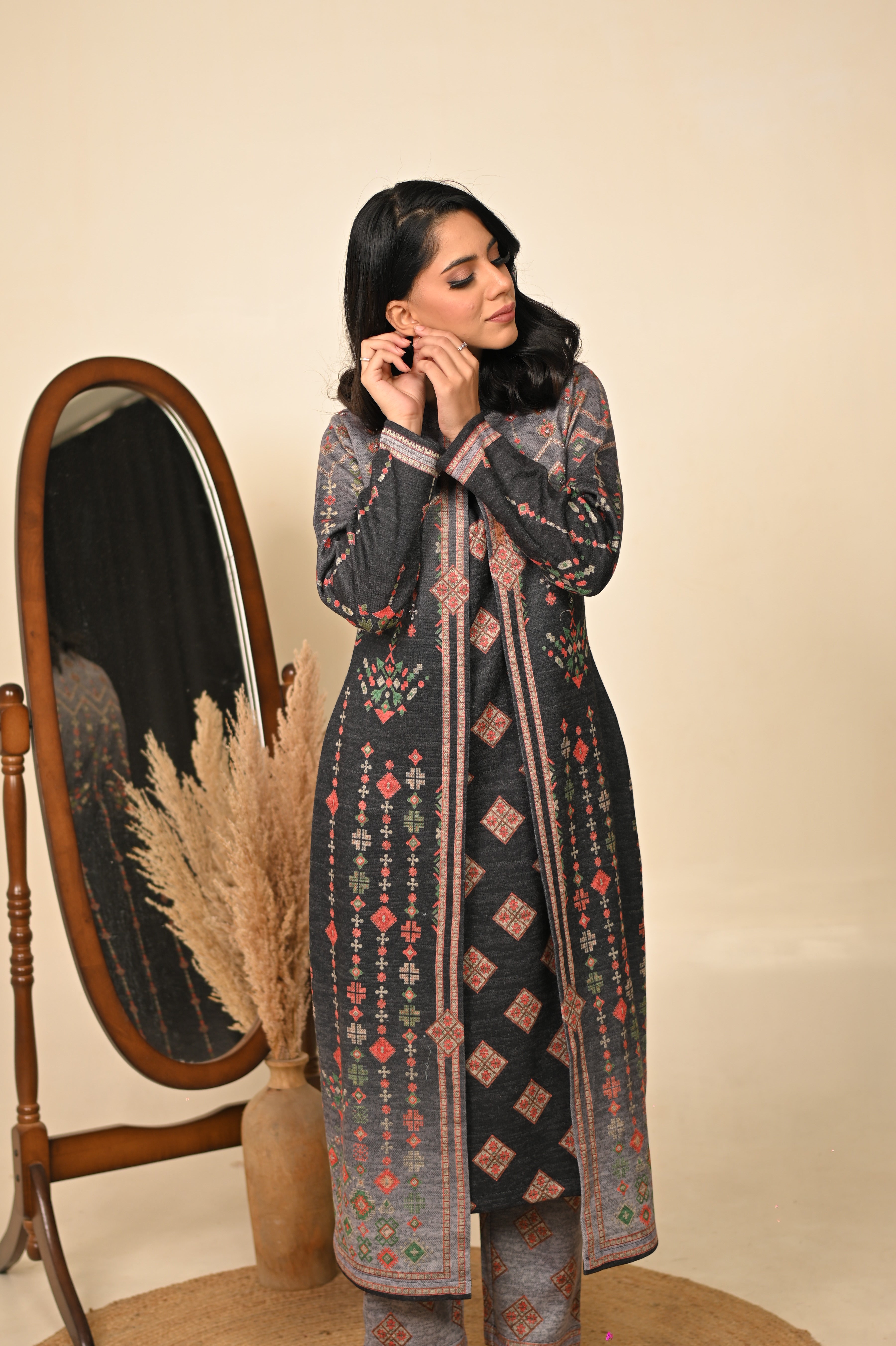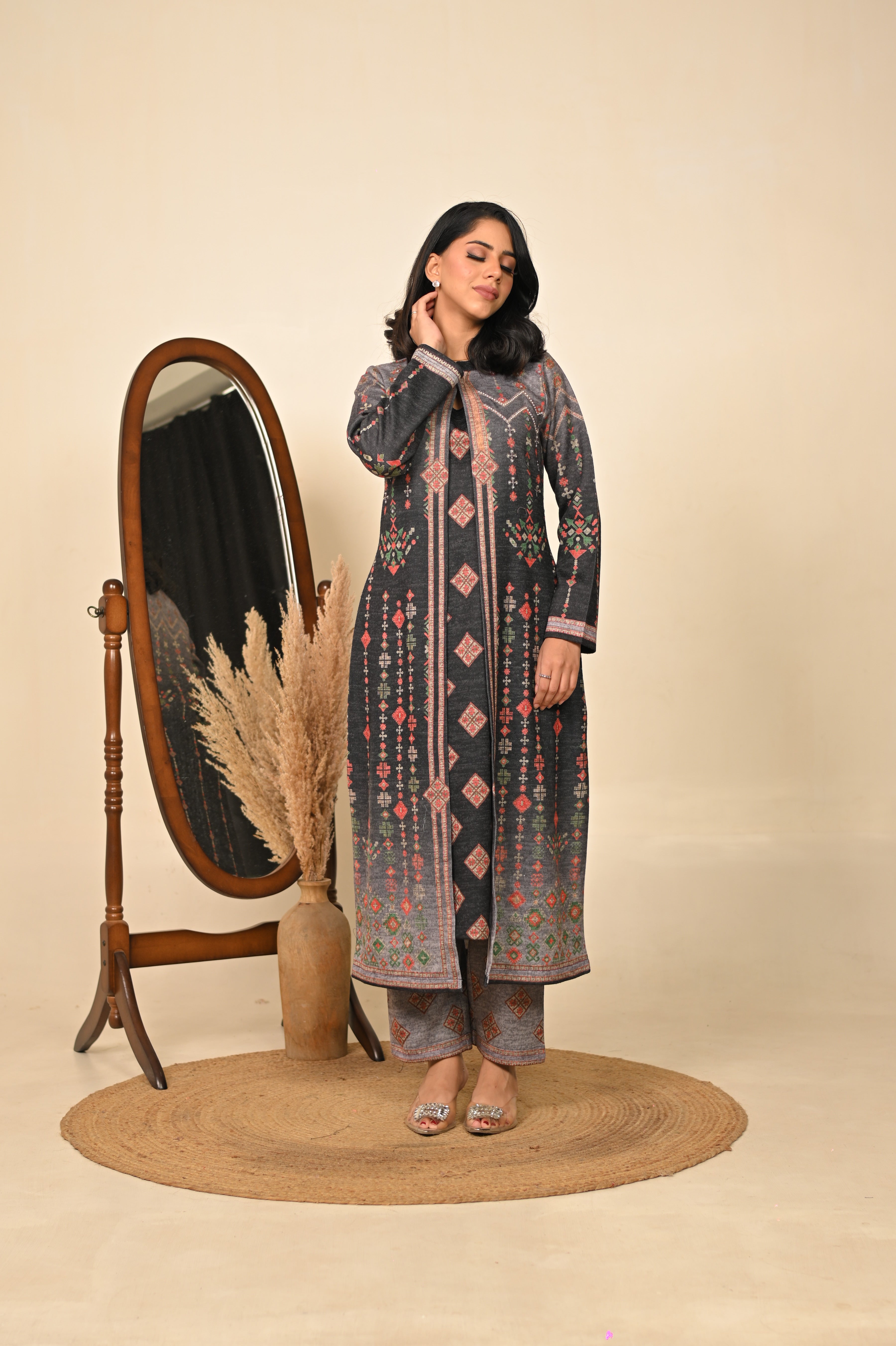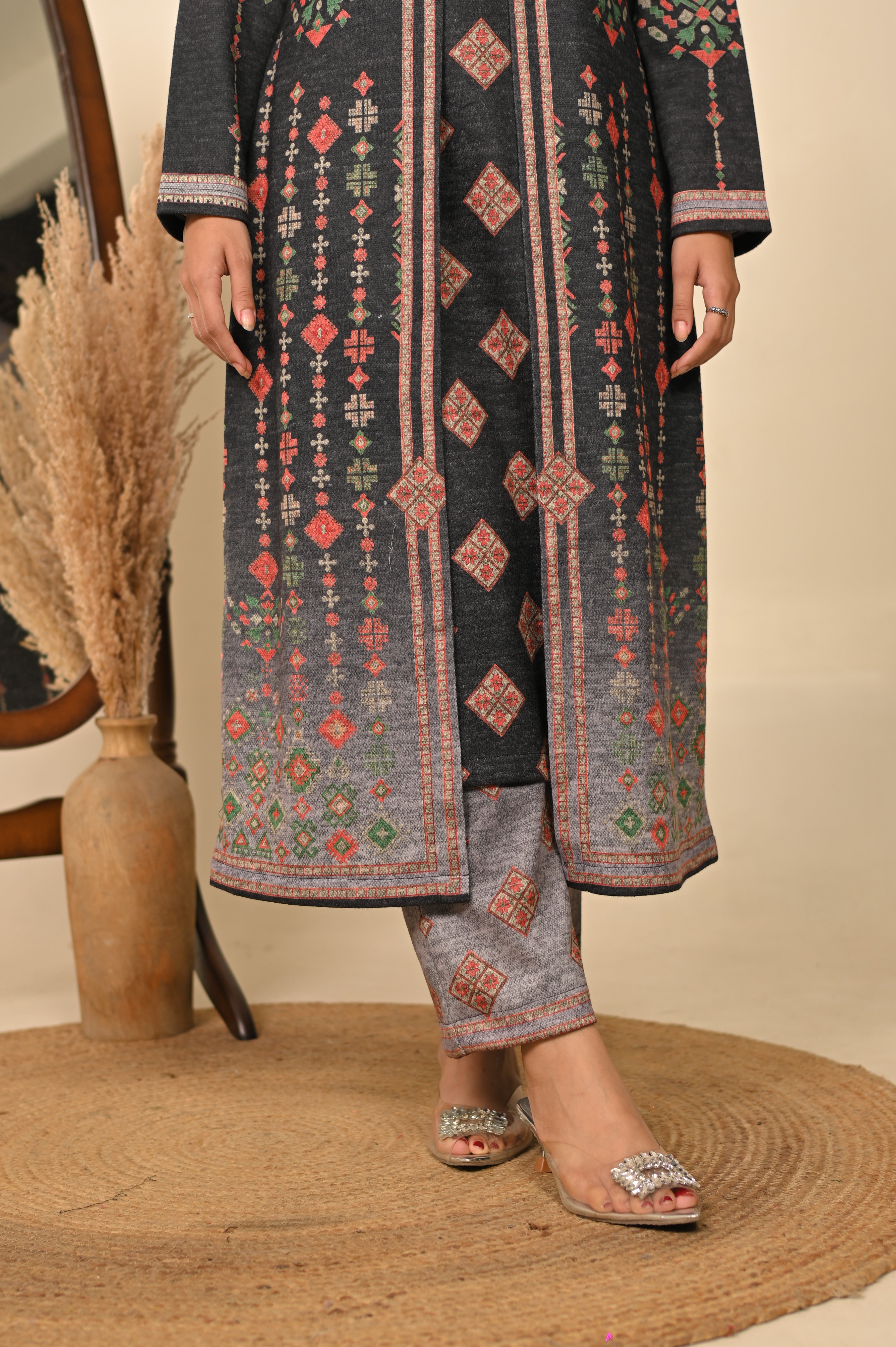 Bold yet graceful, this Black Printed 3-piece Coord Set celebrates the timeless charm of black. Featuring a fluid plazo, elegant kurta, and a statement printed jacket, it’s designed to bring together comfort and sophistication. Perfect for festive nights, intimate soirées, or when you simply want to make black your statement of elegance.