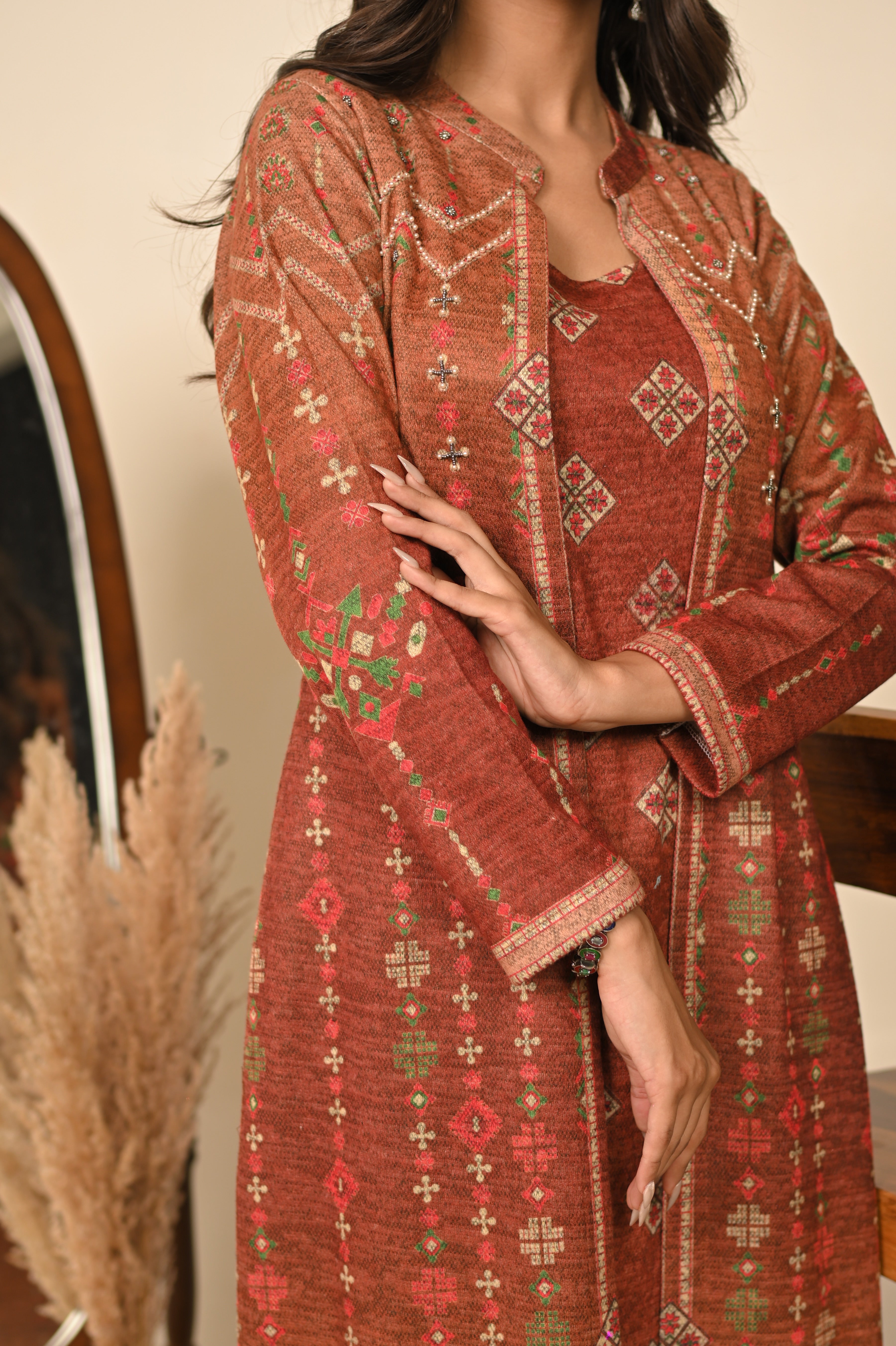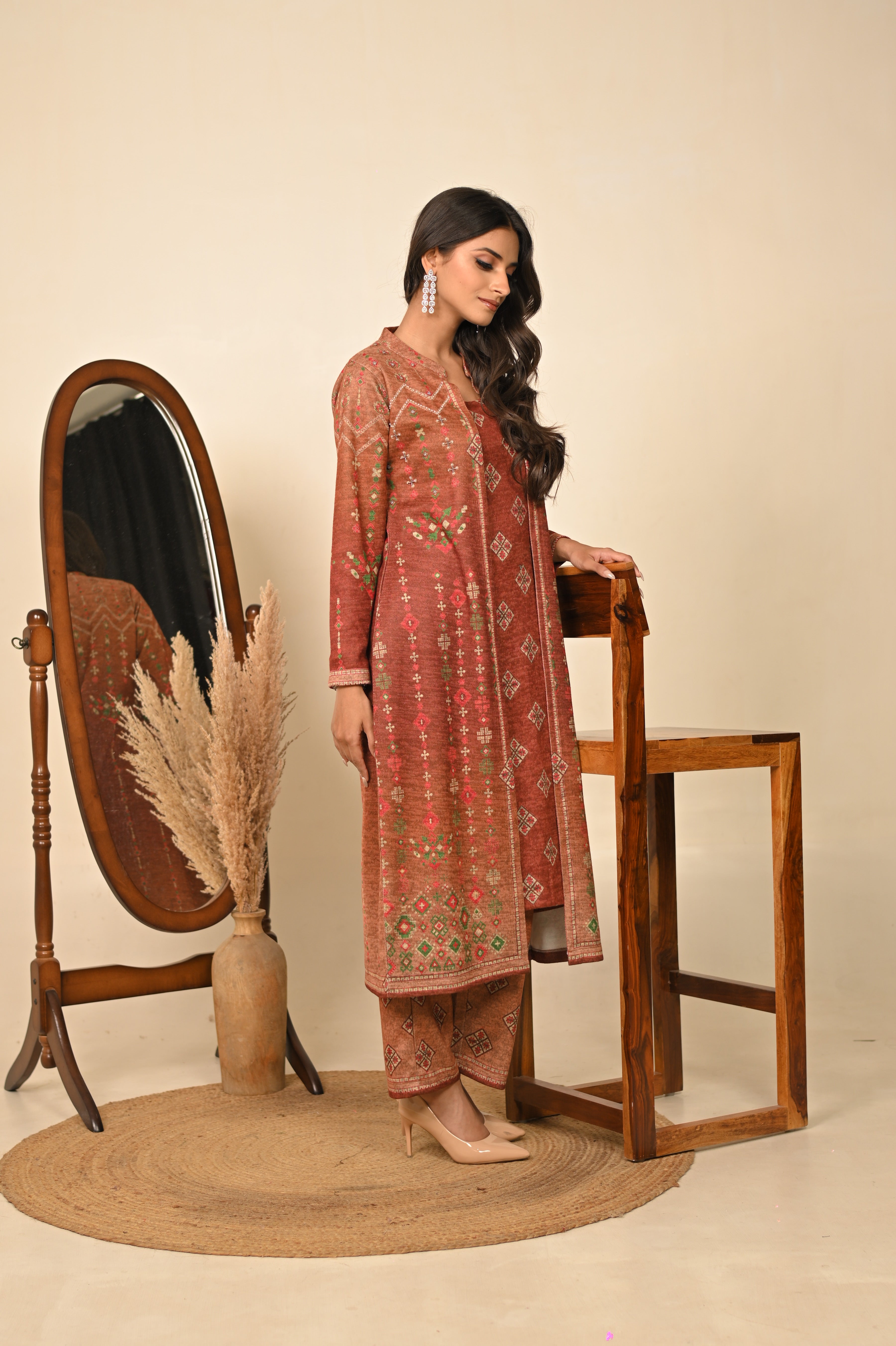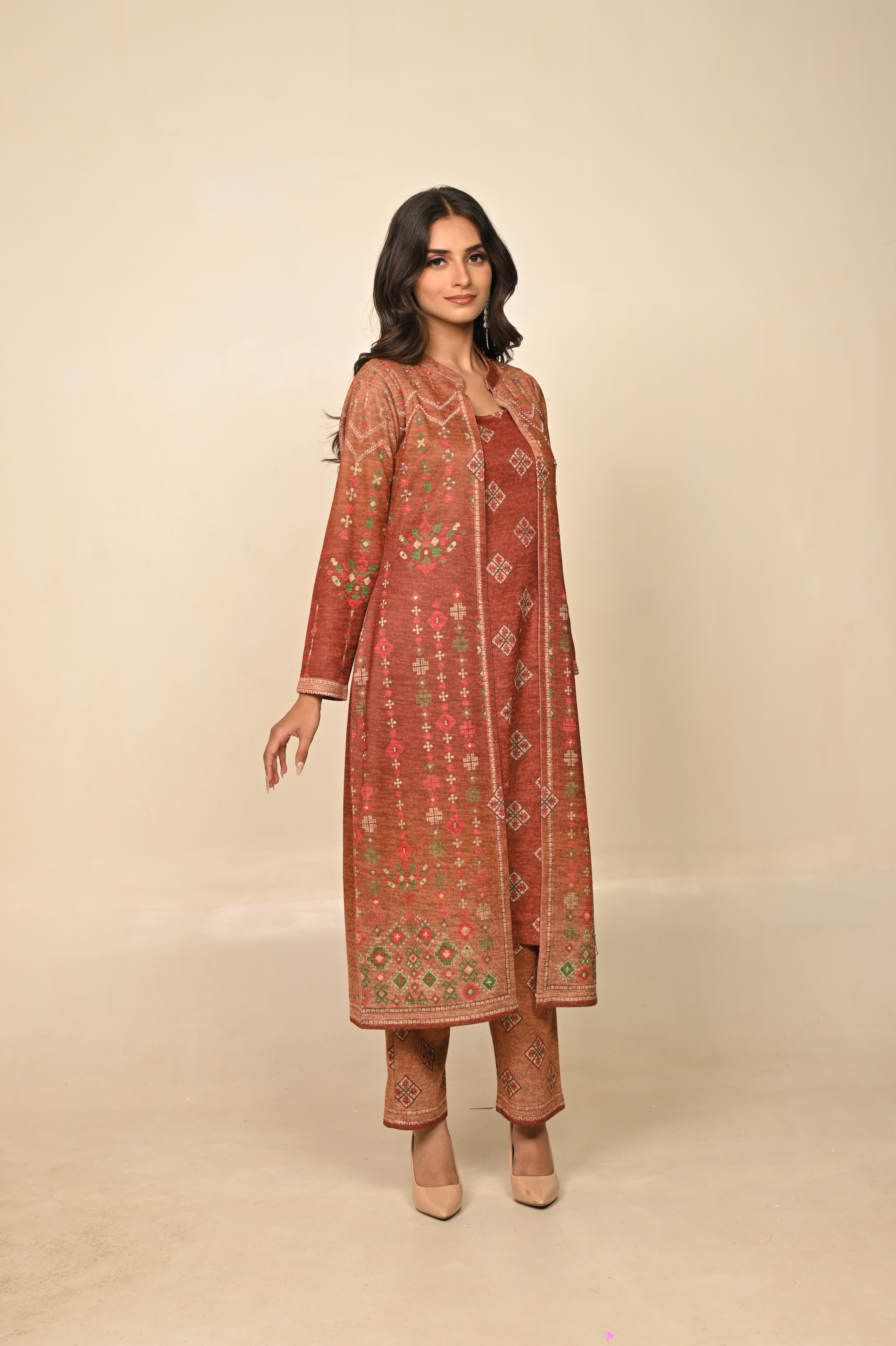 Infused with the earthy charm of Gulnaar hues, this three-piece coord set is a poetic blend of tradition and elegance. With its flowing plazo, classic kurta, and statement jacket, it evokes the warmth of saffron skies and the grace of timeless Indian artistry — perfect for winter festivities and beyond.