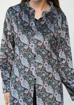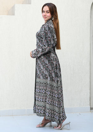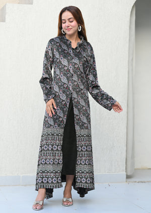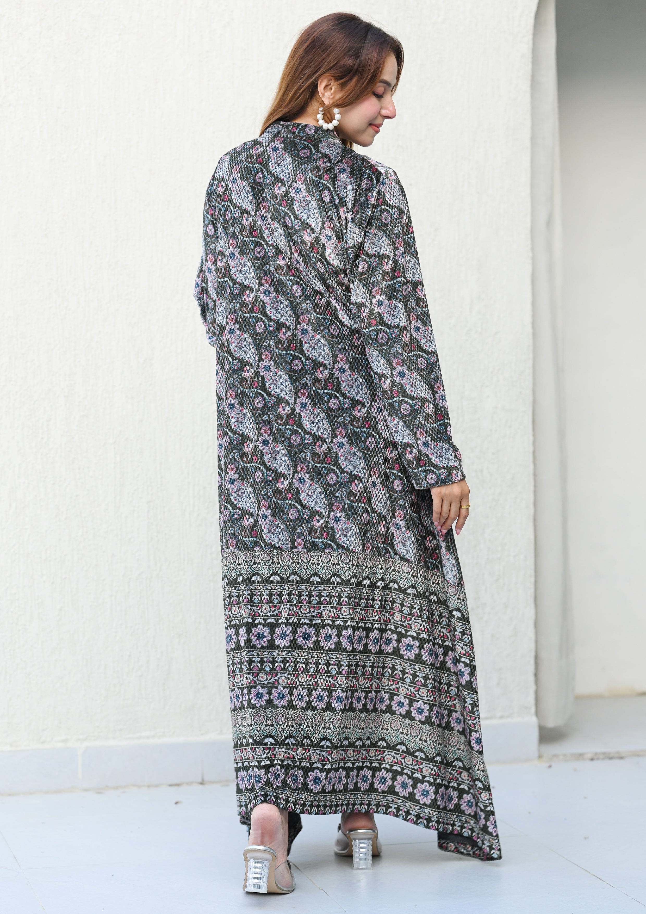 An ode to layered elegance — this green Woolen Gown Set features a graceful printed inner paired with a flowy, statement gown. Crafted to keep you warm yet ethereal, it blends royal jamuni hues with delicate prints, making it a winter essential for festive soirées and timeless celebrations.