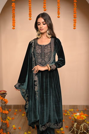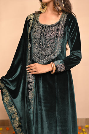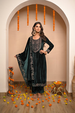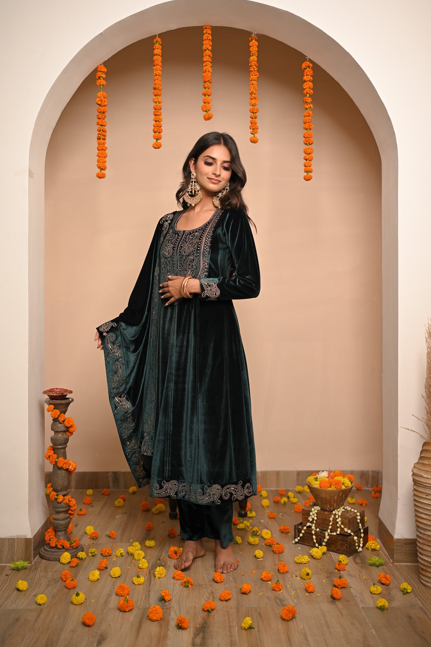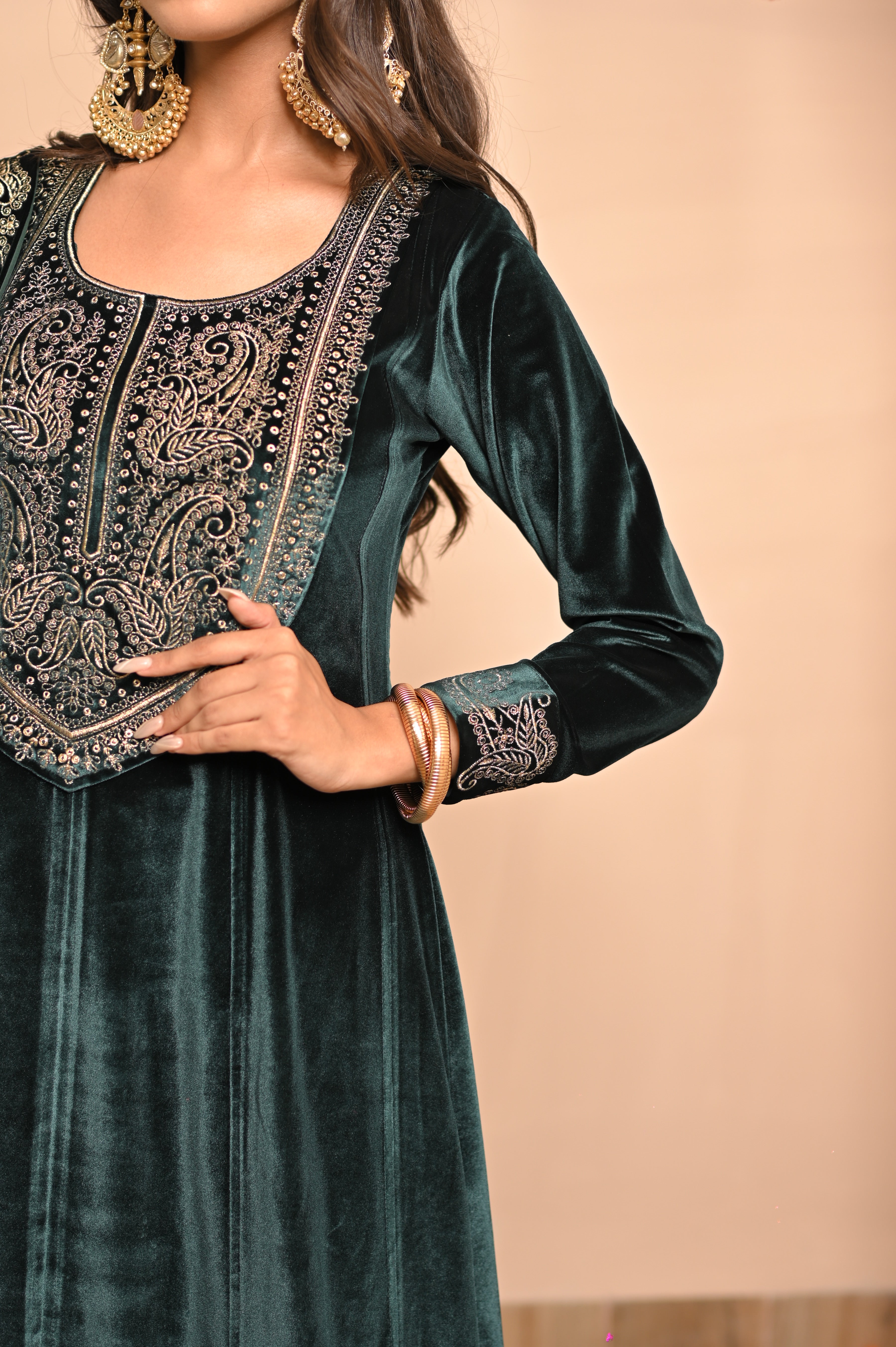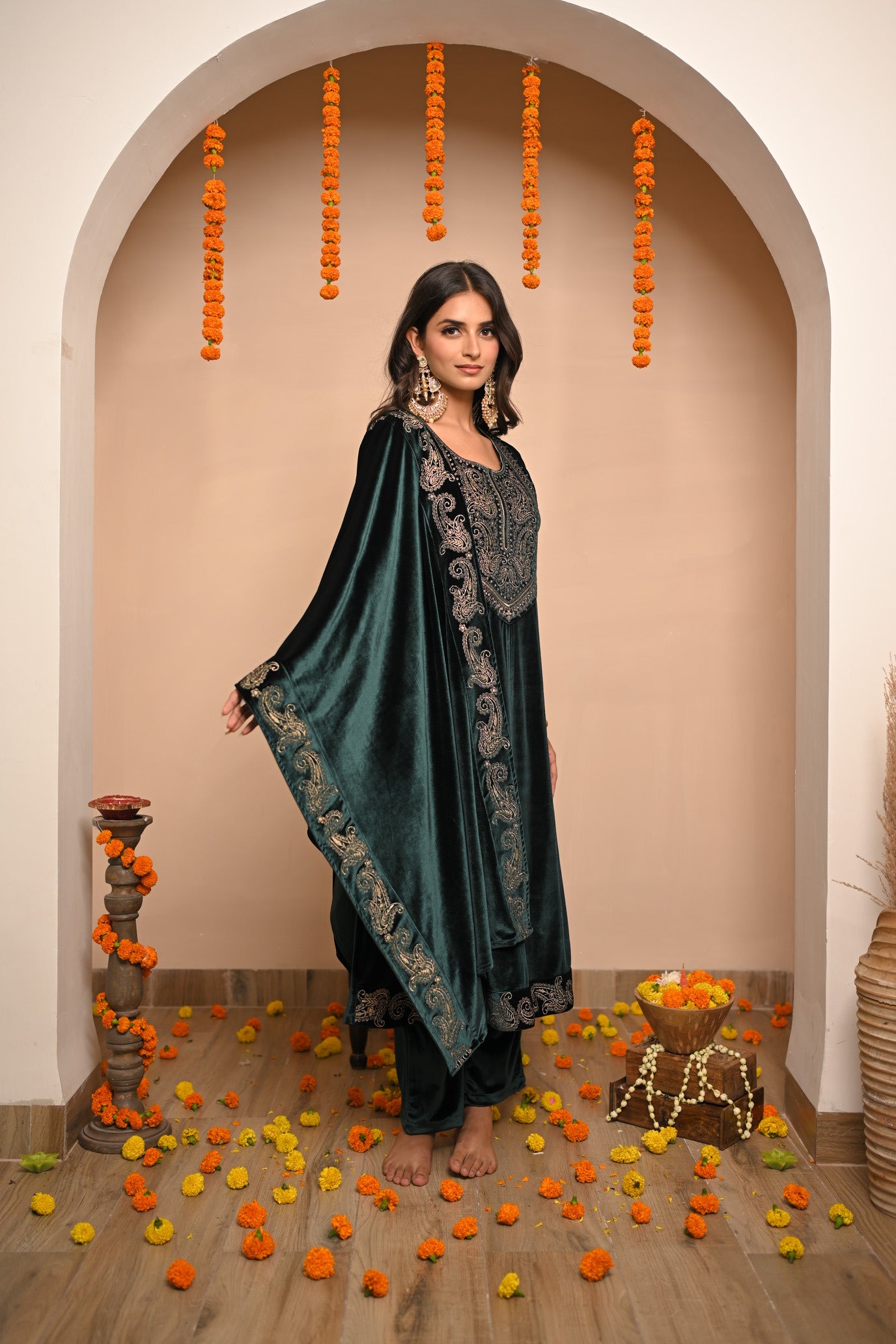 Exuding royal elegance, this Velvet Embroidered Dark Green Kurta Set is a timeless winter classic. Crafted in plush velvet and detailed with intricate embroidery, it reflects the grandeur of heritage attire while offering modern comfort. A perfect ensemble for weddings, festive evenings, and regal celebrations.