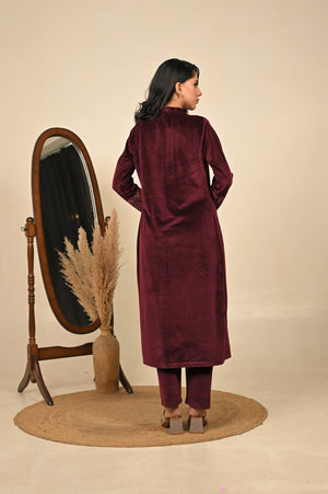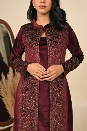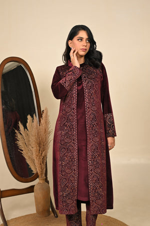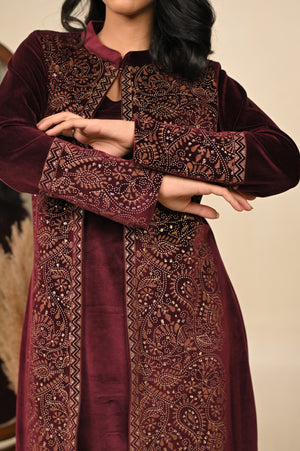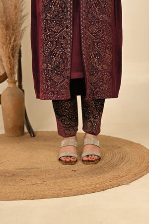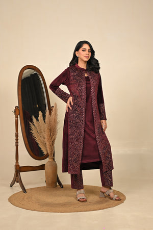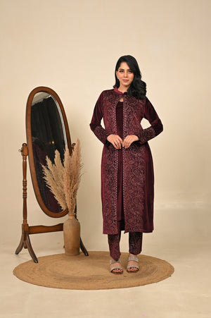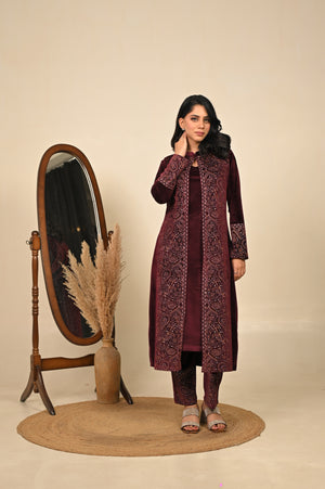 Luxurious three-piece kurta set in a deep maroon tone, adorned with detailed prints that embody warmth and tradition. Featuring a flowing kurta, palazzo pants, and a coordinating printed jacket, this ensemble is designed for festive celebrations and refined winter occasions. A perfect blend of rich color and intricate craftsmanship, it delivers a regal and sophisticated look.