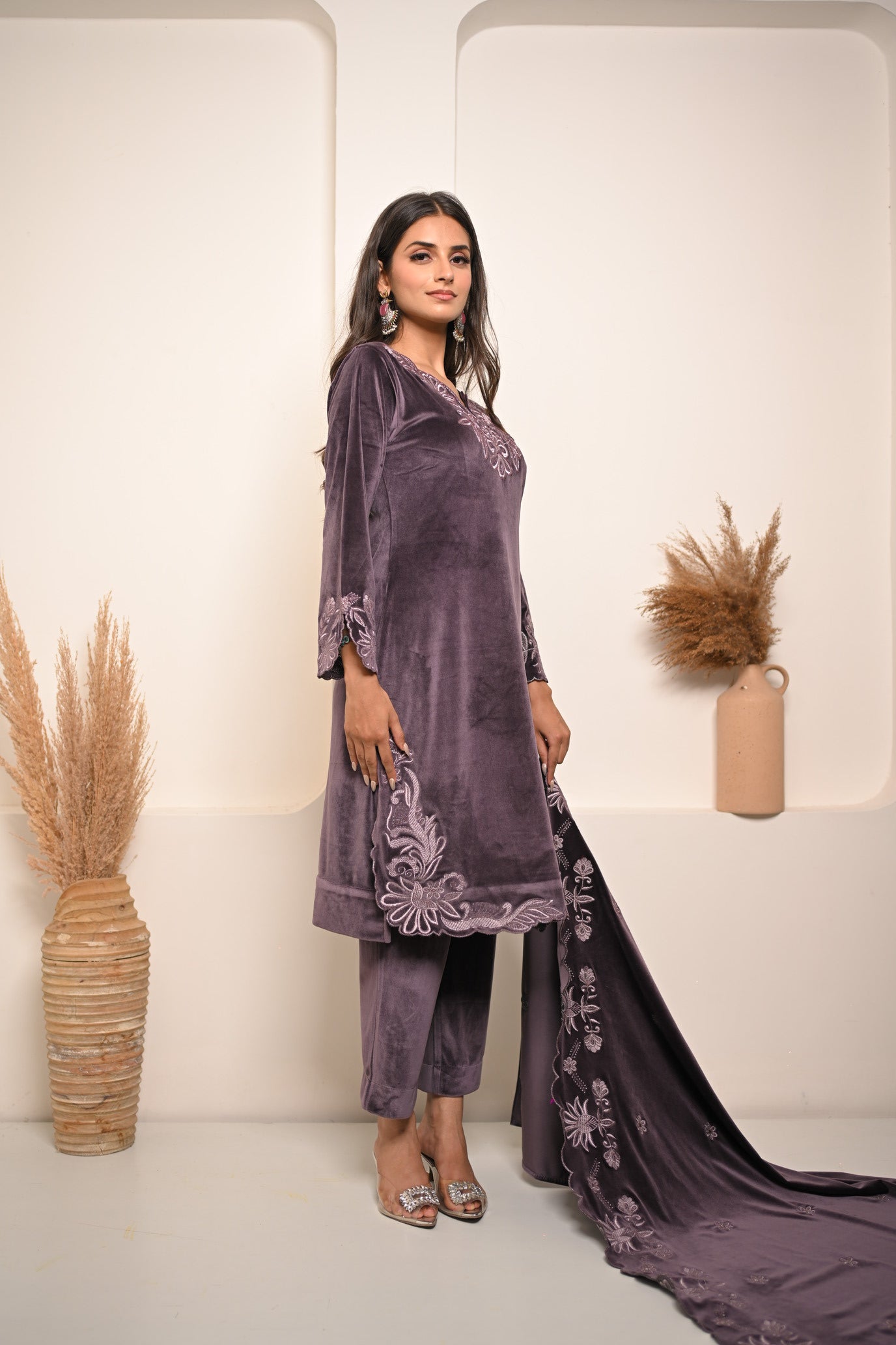 Serene and sophisticated, this lavender velvet Suit set boasts elegant embroidery on the neck hem, complete with a coordinating dupatta for a harmonious and stylish look.