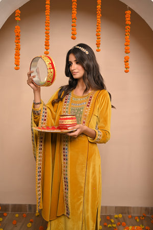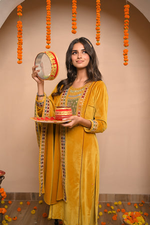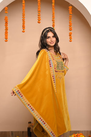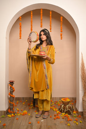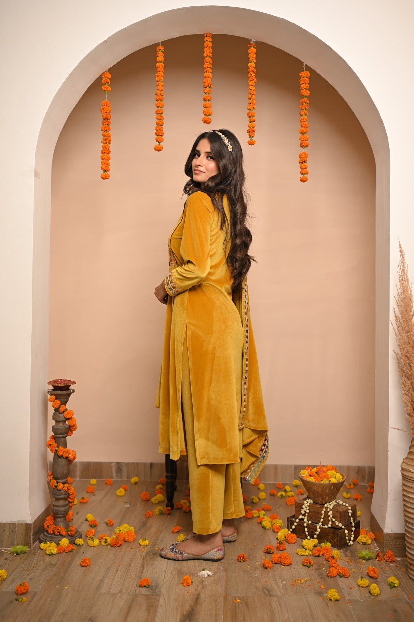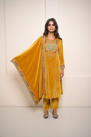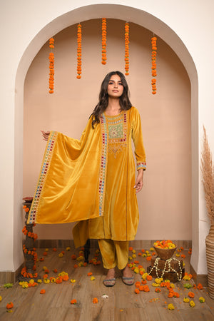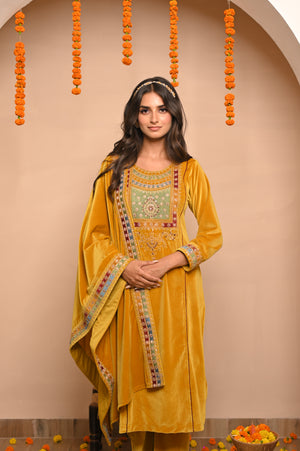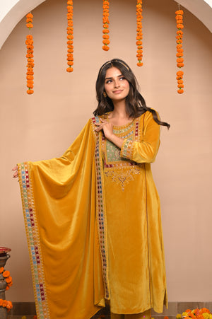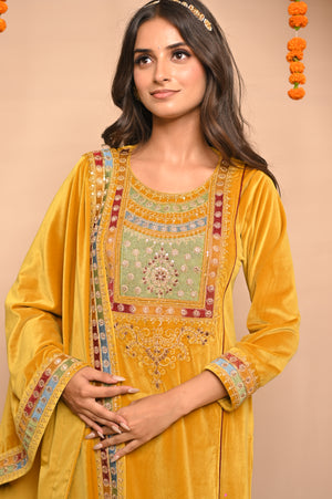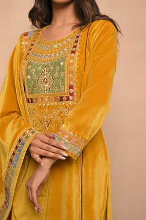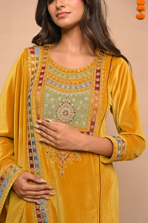 Radiant three-piece velvet set in a vibrant yellow, exquisitely detailed with embroidery on the neckline, sleeves, and a complementing dupatta, ideal for festive celebrations.