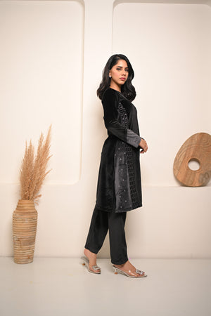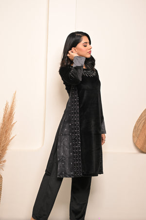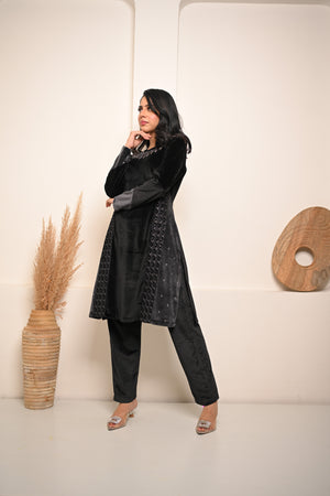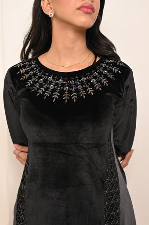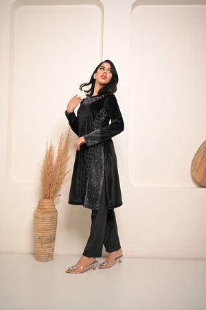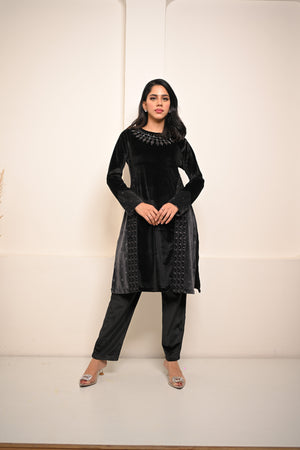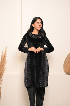 Velvet co-ord featuring intricate hand-embroidered detailing along the neckline and elegant embroidery on the side