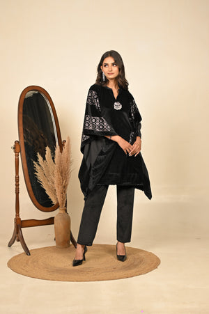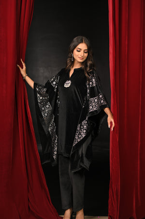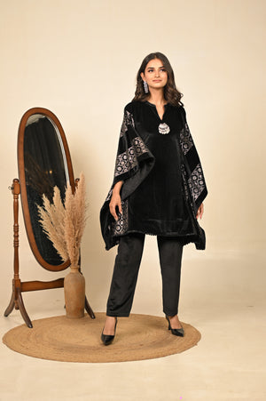 Elegant two-piece co-ord set featuring a luxurious velvet top with front and back prints, paired with a statement accessory for a refined, complete look.