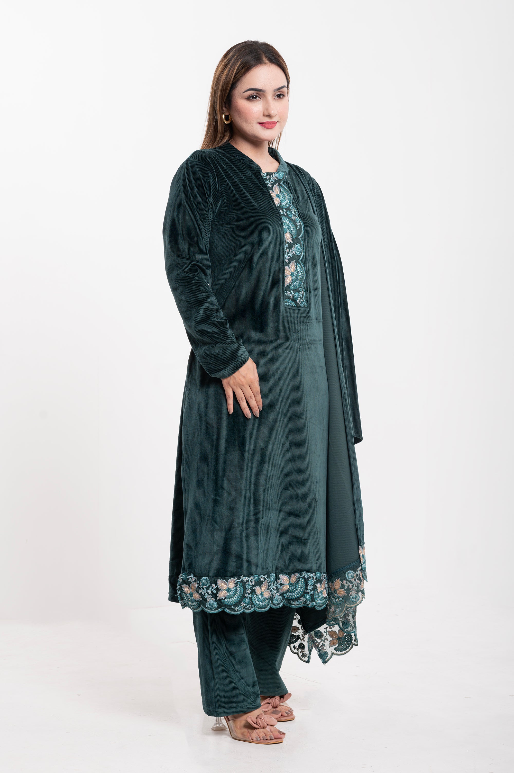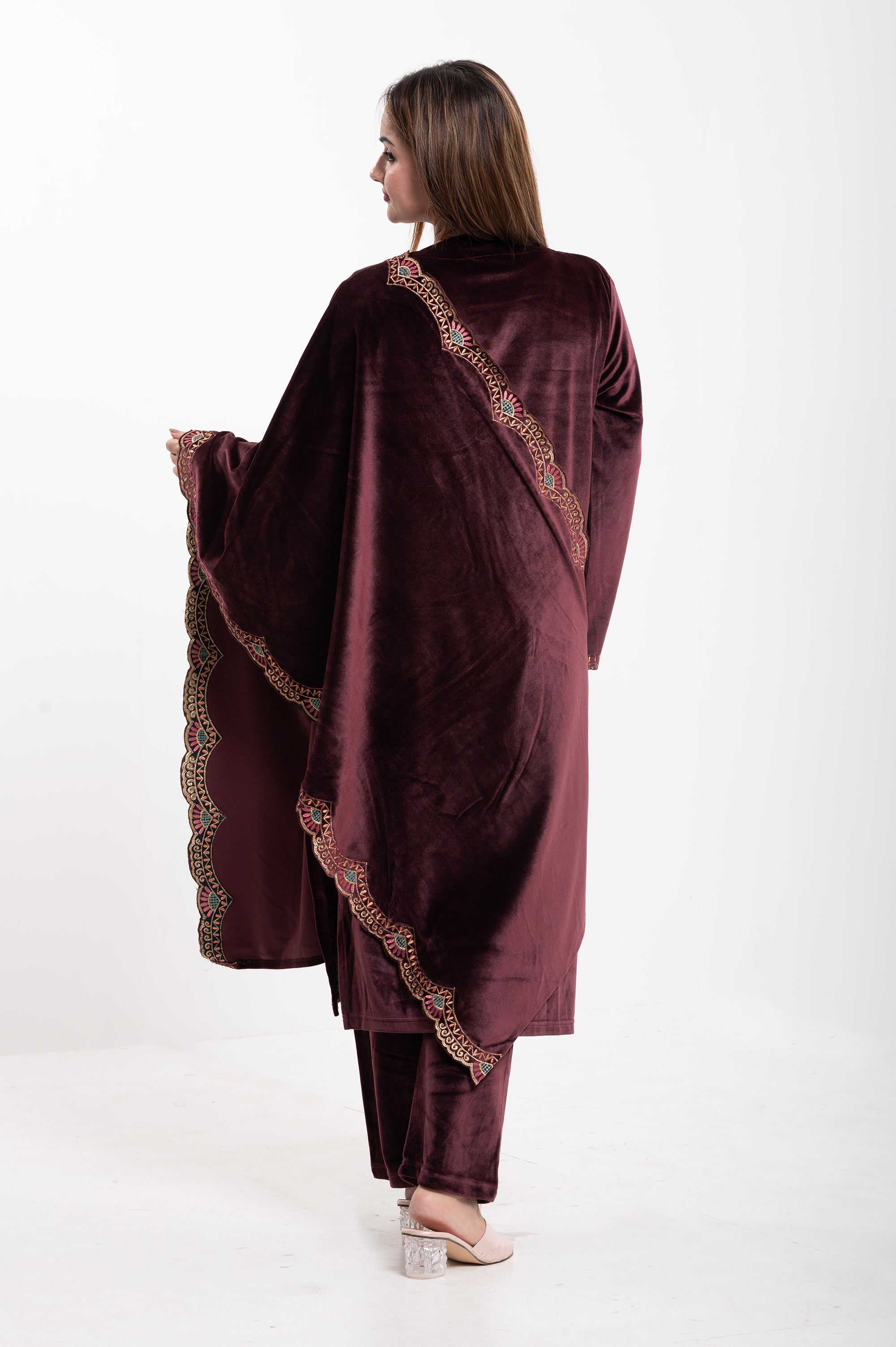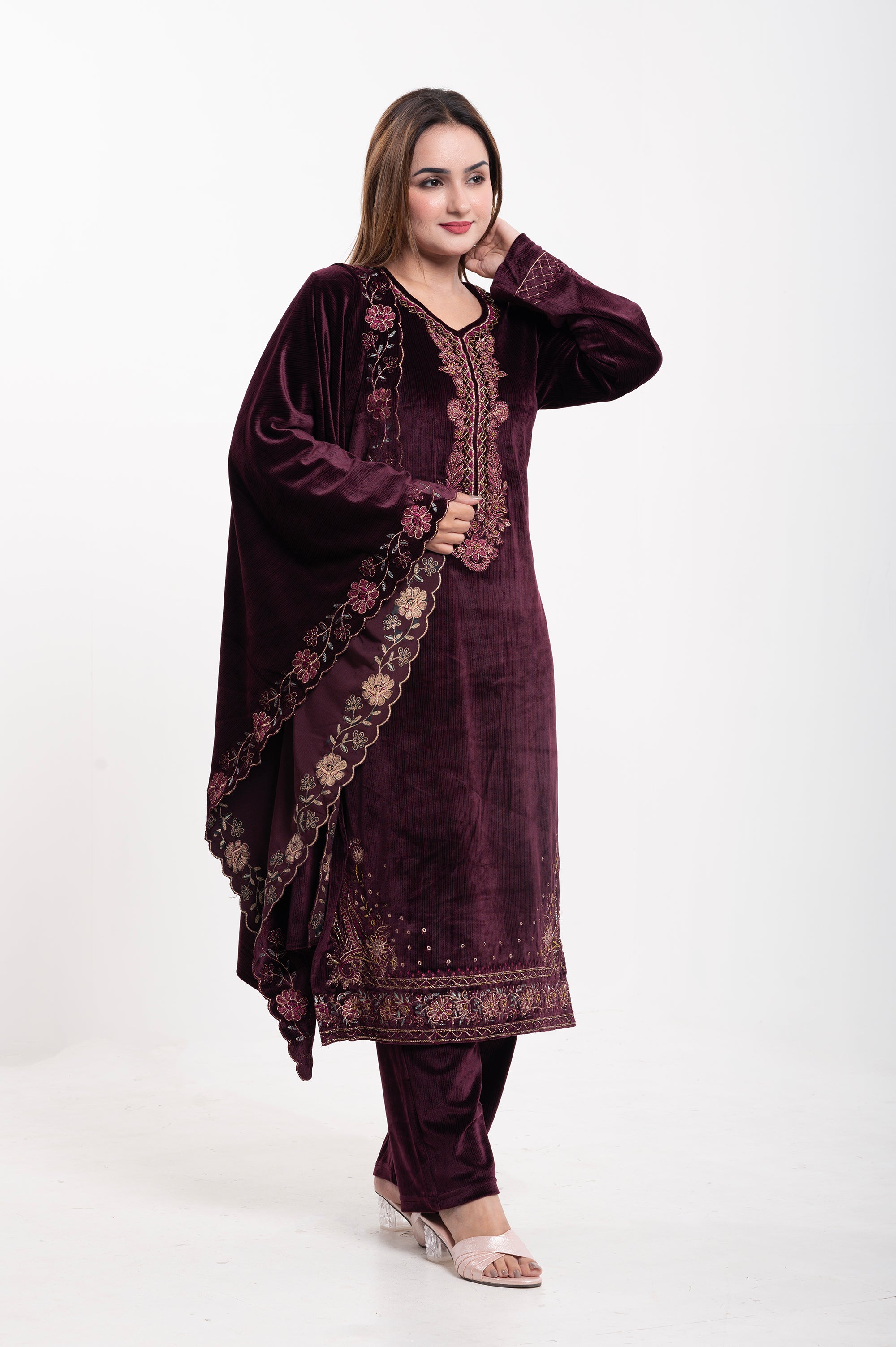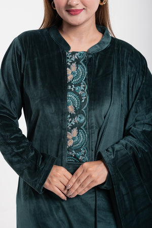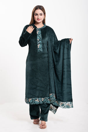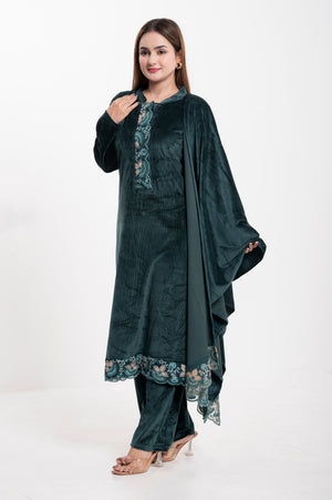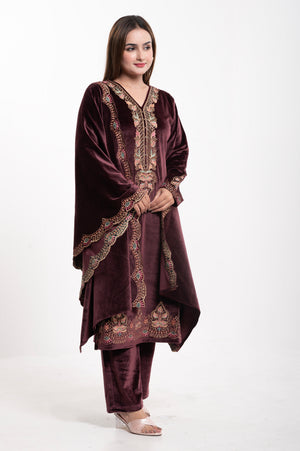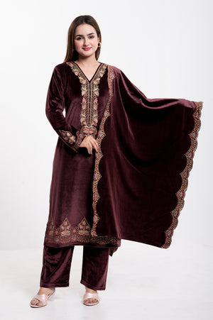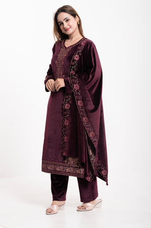 Elevate your ethnic wardrobe with this luxurious Velvet Embroidered Suit, designed for elegance and comfort. Crafted from premium-quality velvet, this ensemble features a straight-cut kurta adorned with intricate multicolor thread embroidery on the neckline, sleeves, and hemline, adding a touch of regal charm. The matching dupatta is highlighted with a beautifully embroidered scalloped border, making it perfect for festive occasions and special gatherings. Paired with coordinated velvet trousers, this outfit combines traditional craftsmanship with modern sophistication.