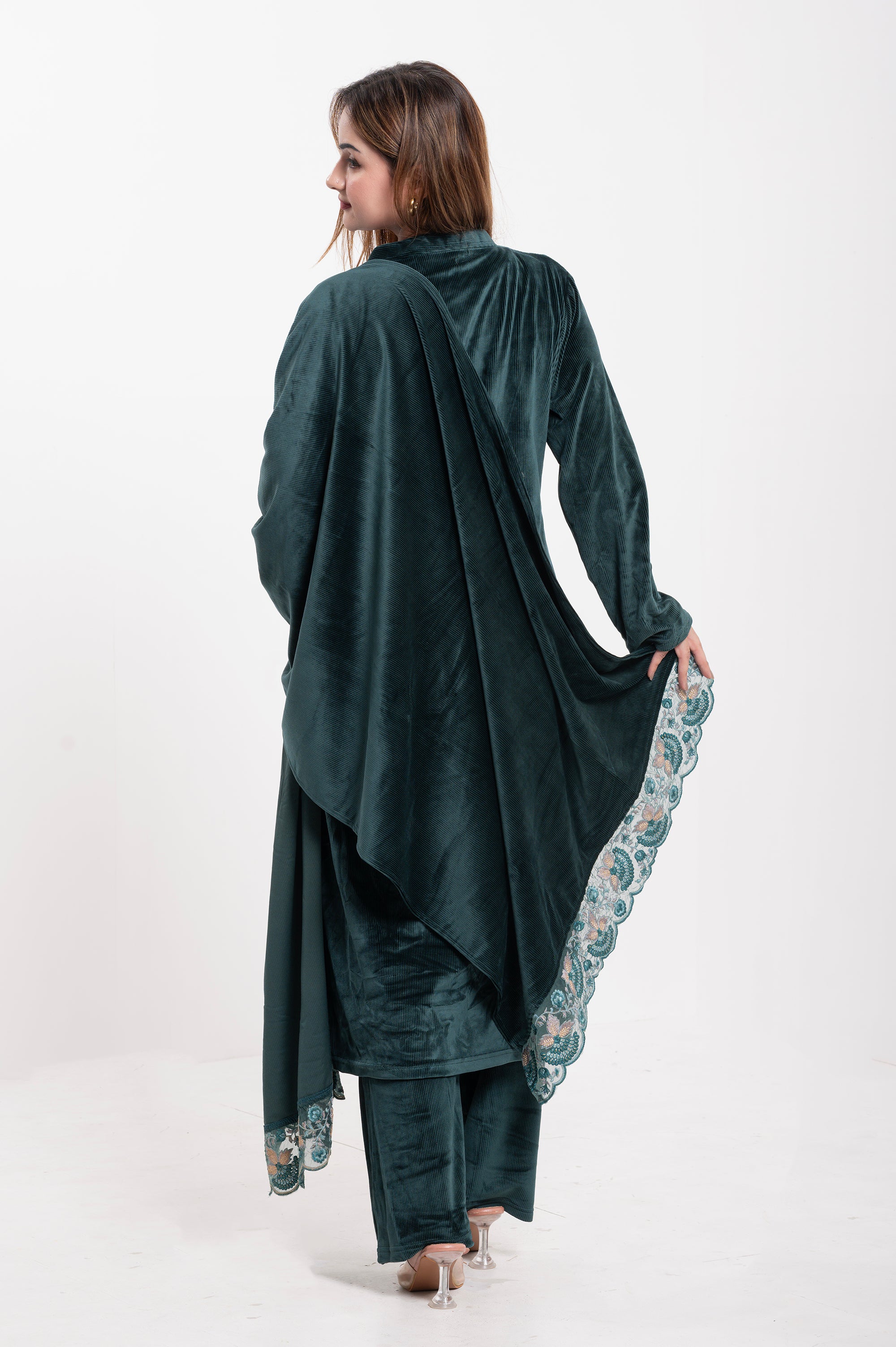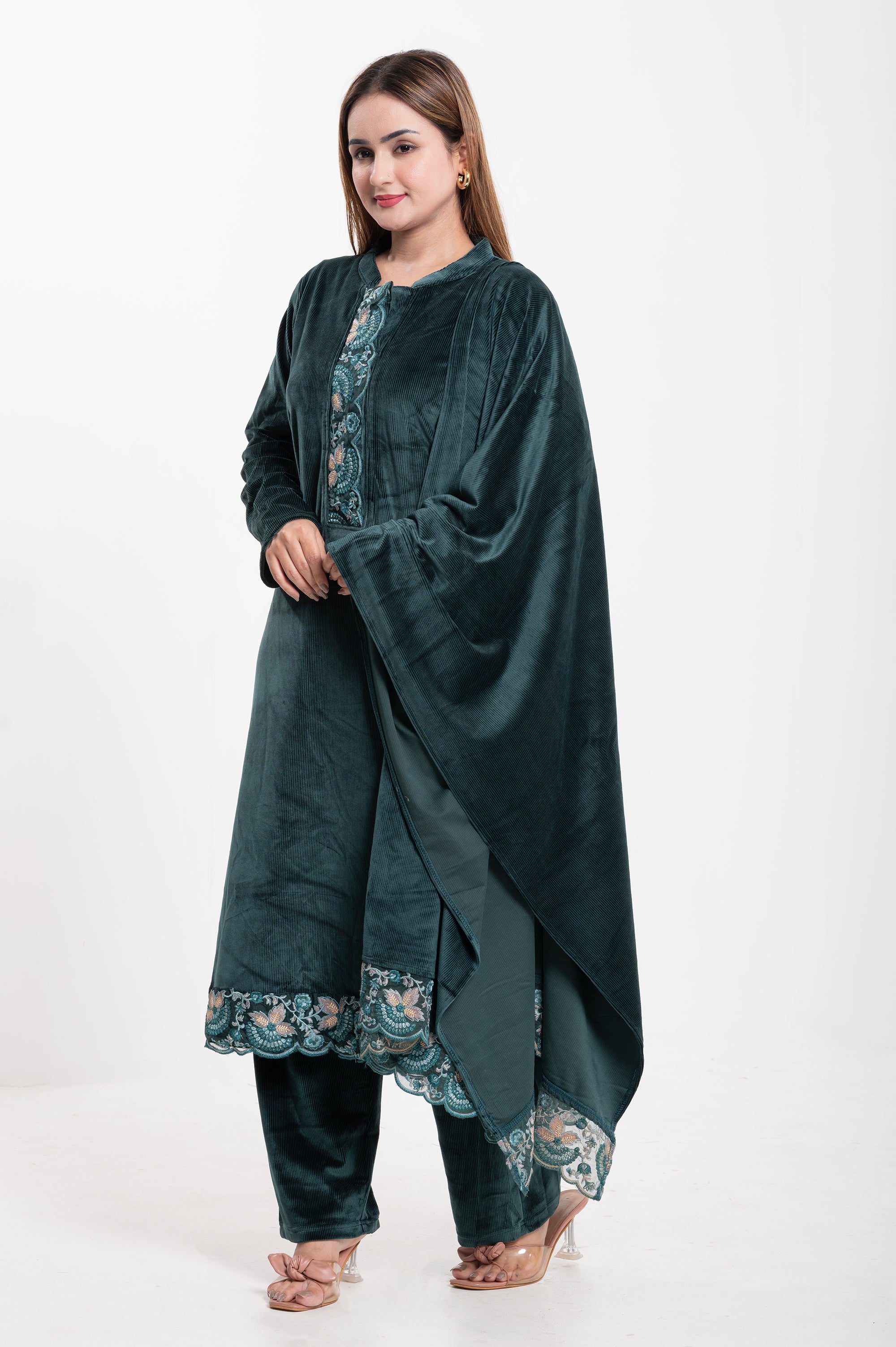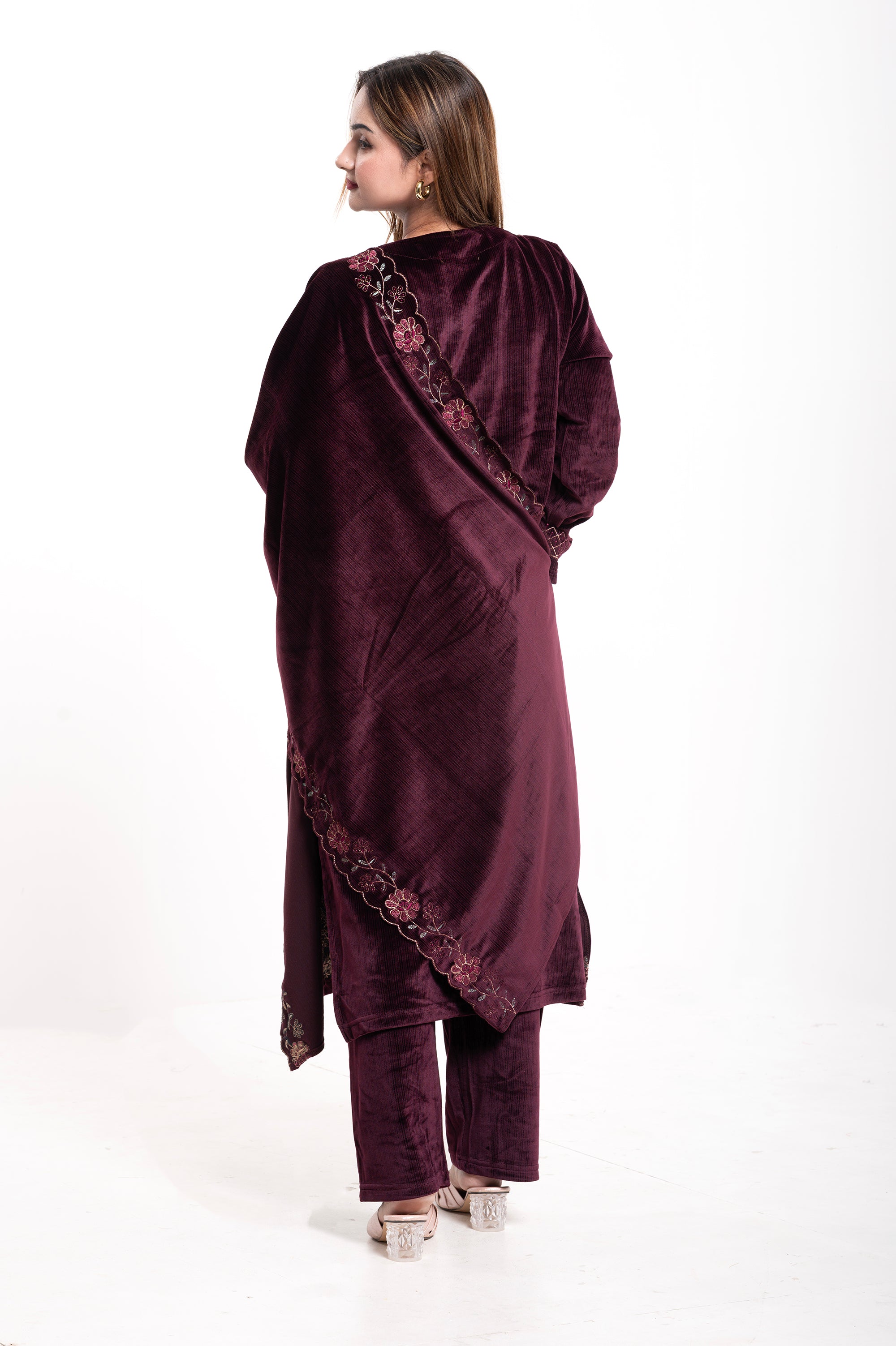 Elevate your ethnic wardrobe with this luxurious Velvet Embroidered Suit, designed for elegance and comfort. Crafted from premium-quality velvet, this ensemble features a straight-cut kurta adorned with intricate multicolor thread embroidery on the neckline, sleeves, and hemline, adding a touch of regal charm. The matching dupatta is highlighted with a beautifully embroidered scalloped border, making it perfect for festive occasions and special gatherings. Paired with coordinated velvet trousers, this outfit combines traditional craftsmanship with modern sophistication.