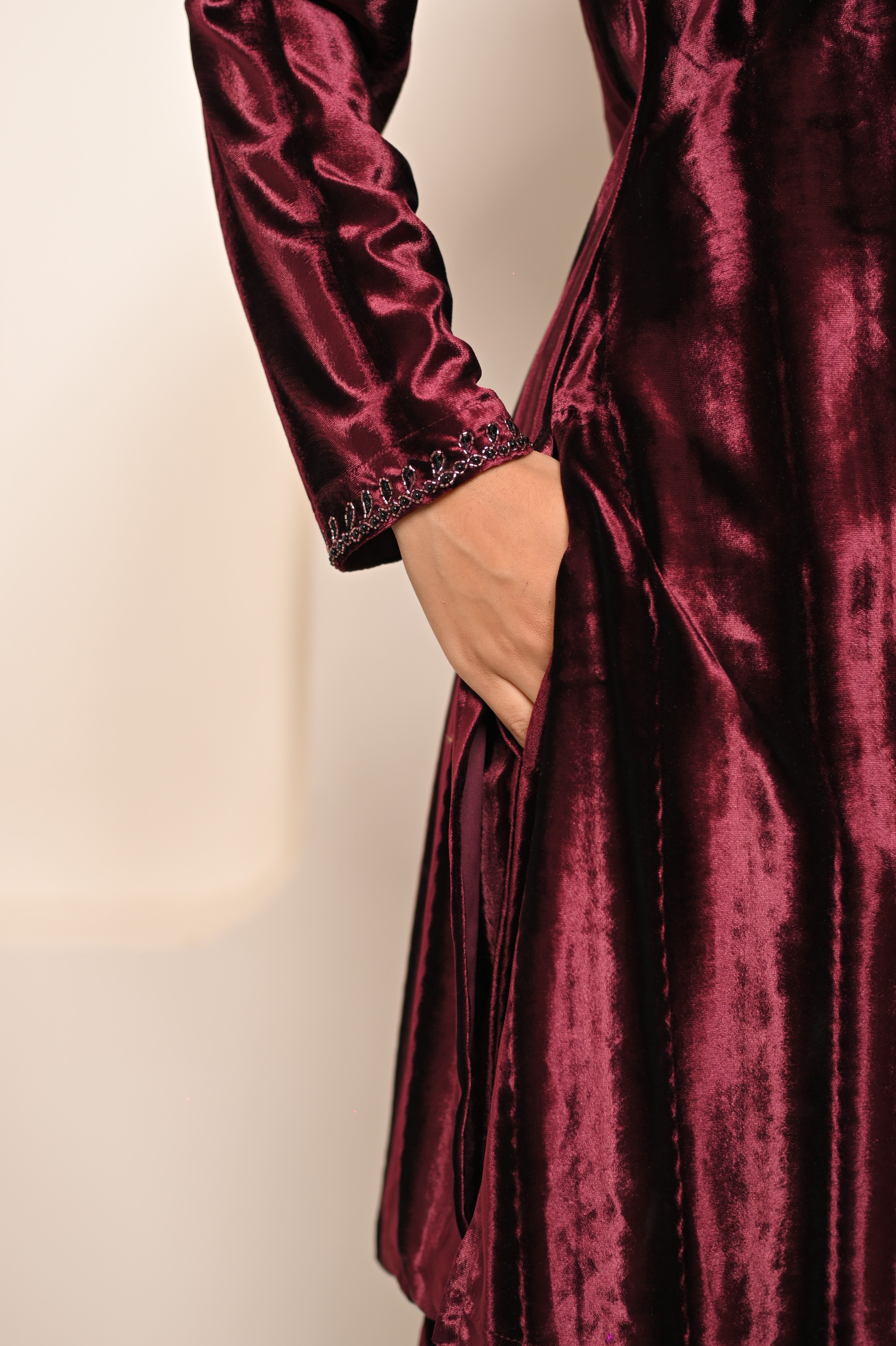 Velvet co-ord featuring intricate hand-embroidered detailing along the neckline and elegant embroidery on the sleeves