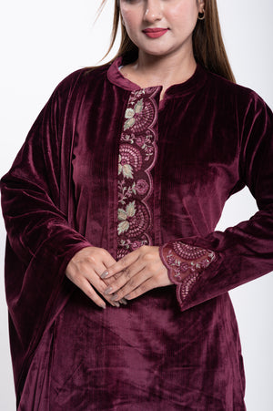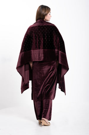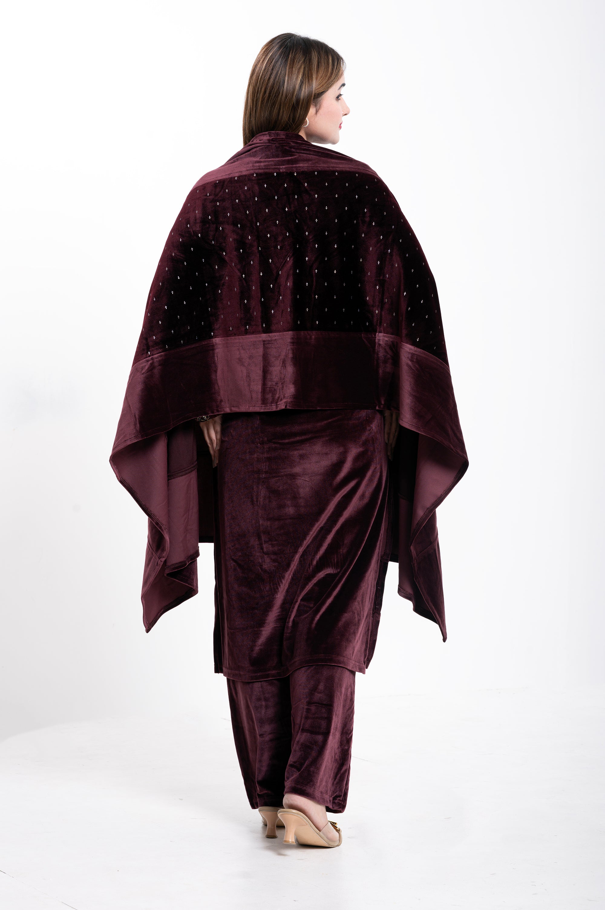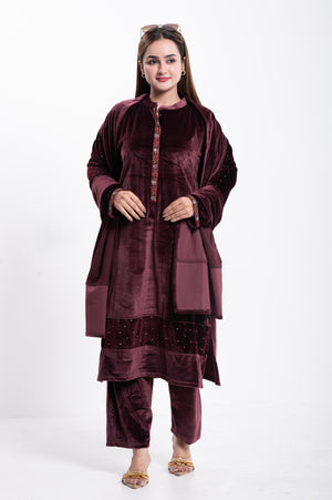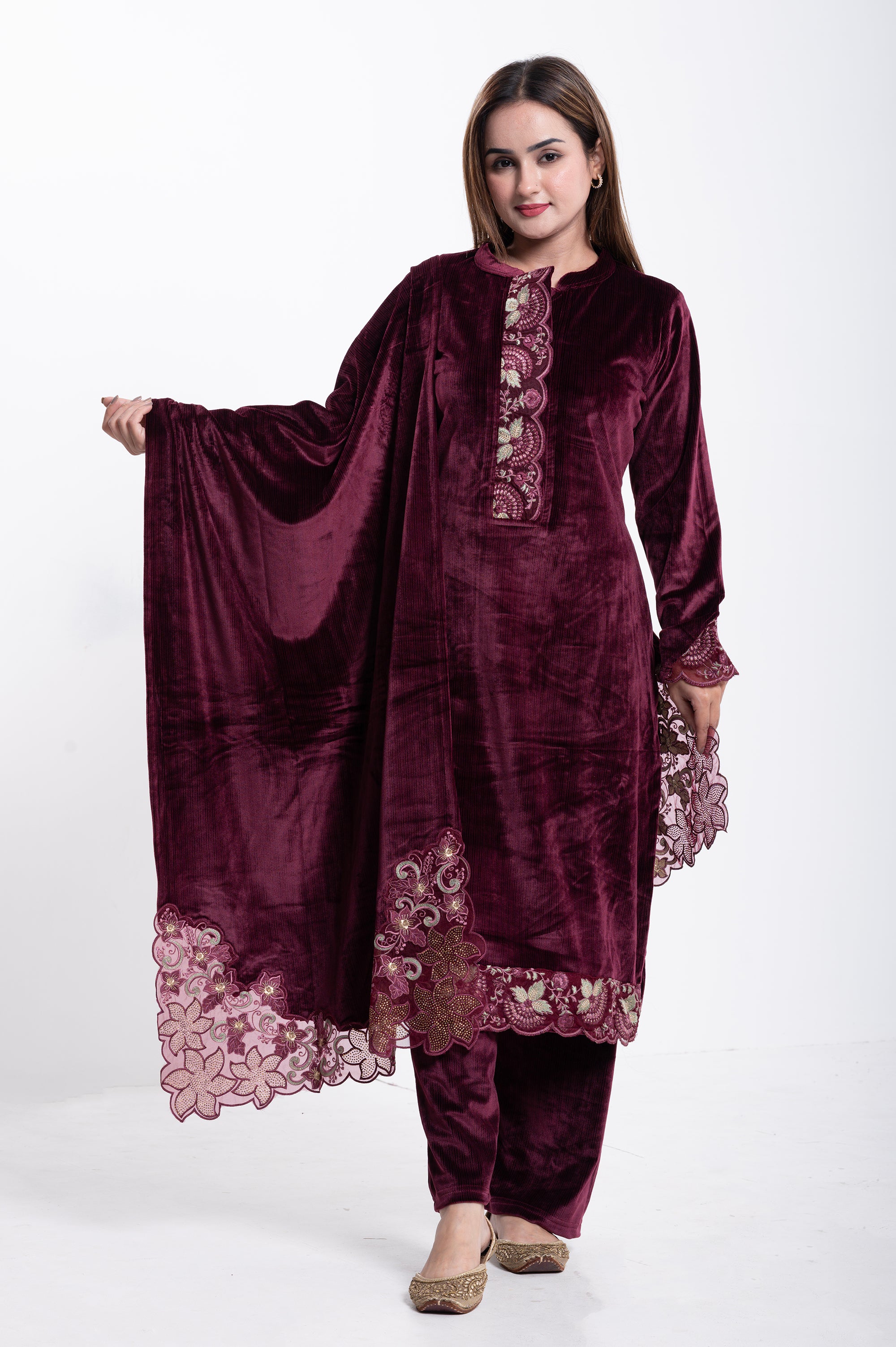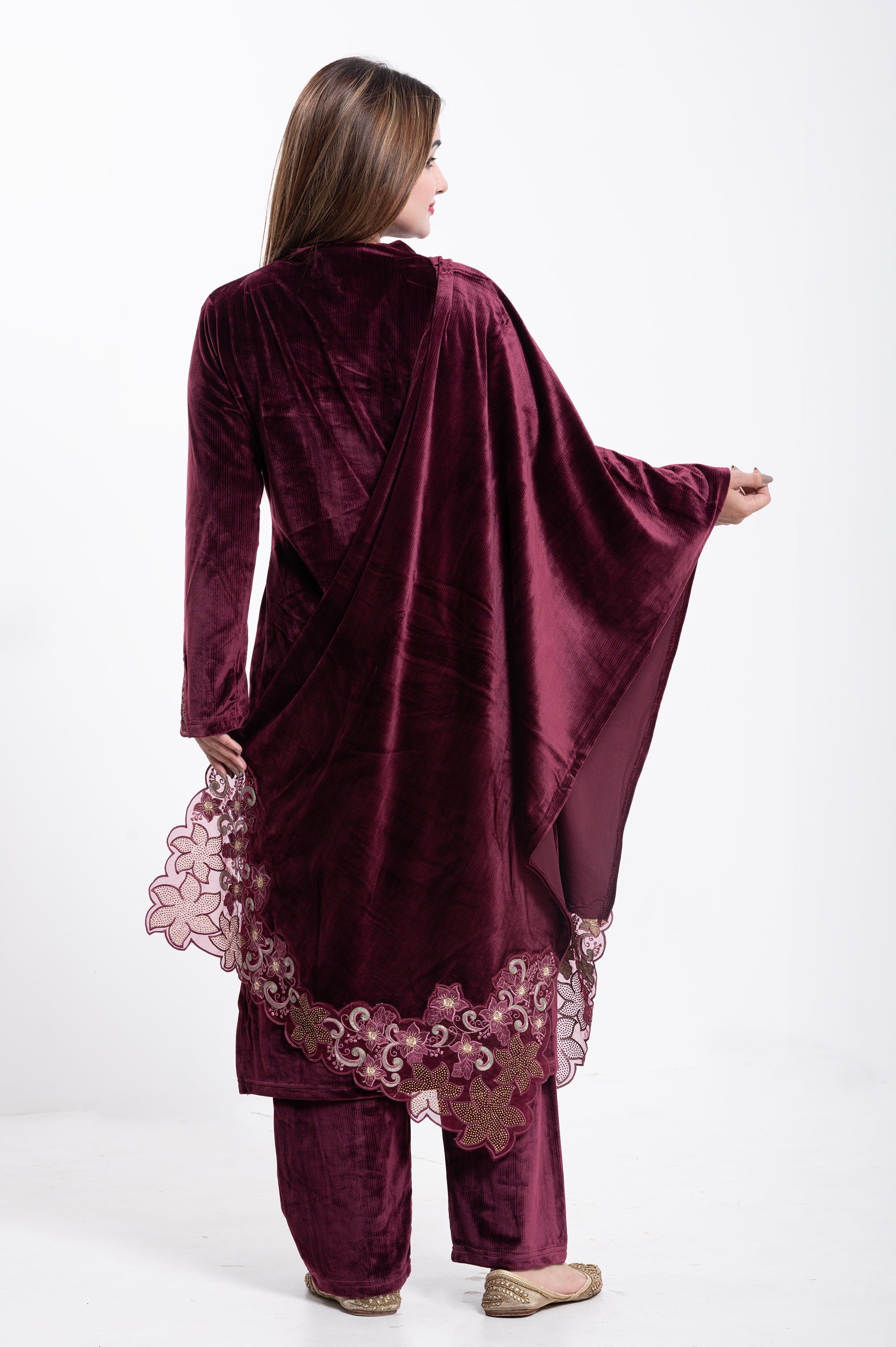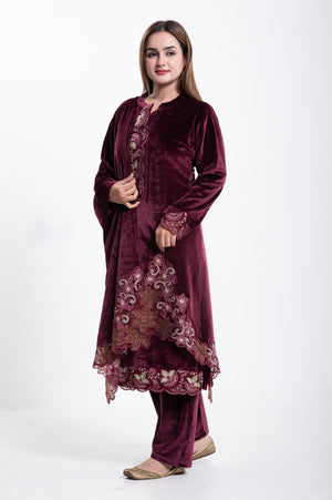 Step into timeless elegance with our Velvet Maroon Embroidered 3-Piece Suit, crafted to perfection for festive and formal occasions. Made from premium quality velvet, this outfit ensures luxurious comfort with a regal charm. The deep maroon hue is beautifully complemented with intricate floral embroidery on the neckline, sleeves, and borders, adding a touch of sophistication.