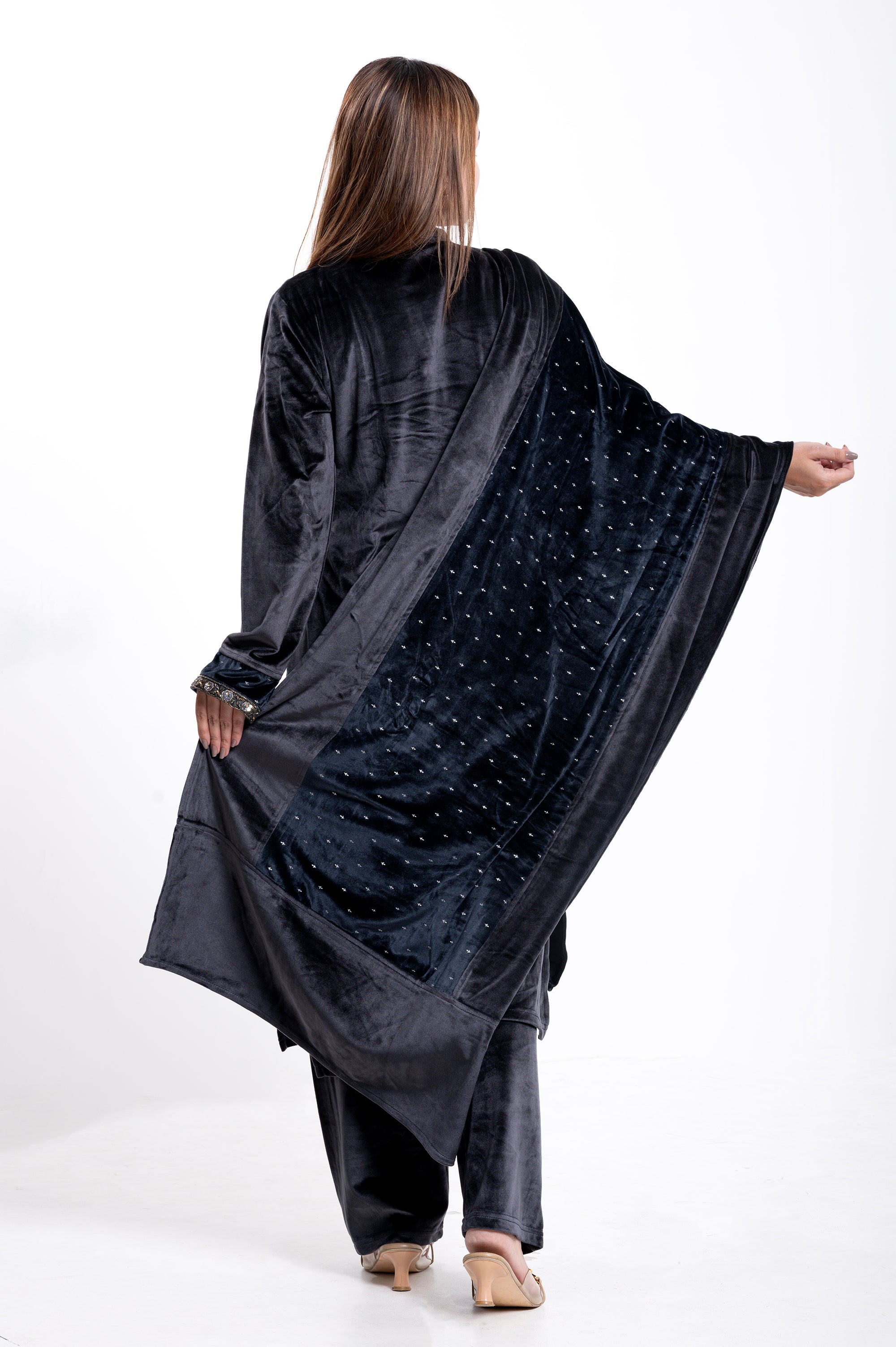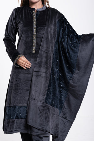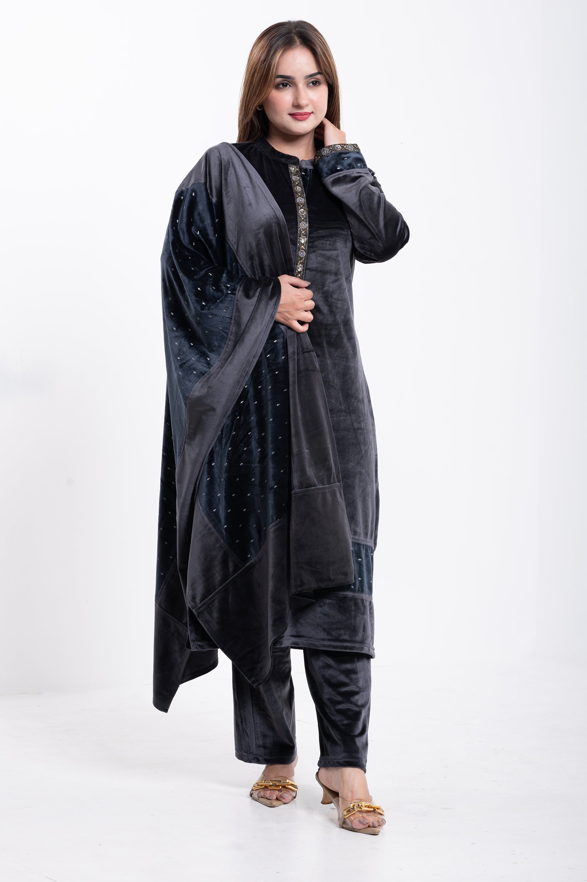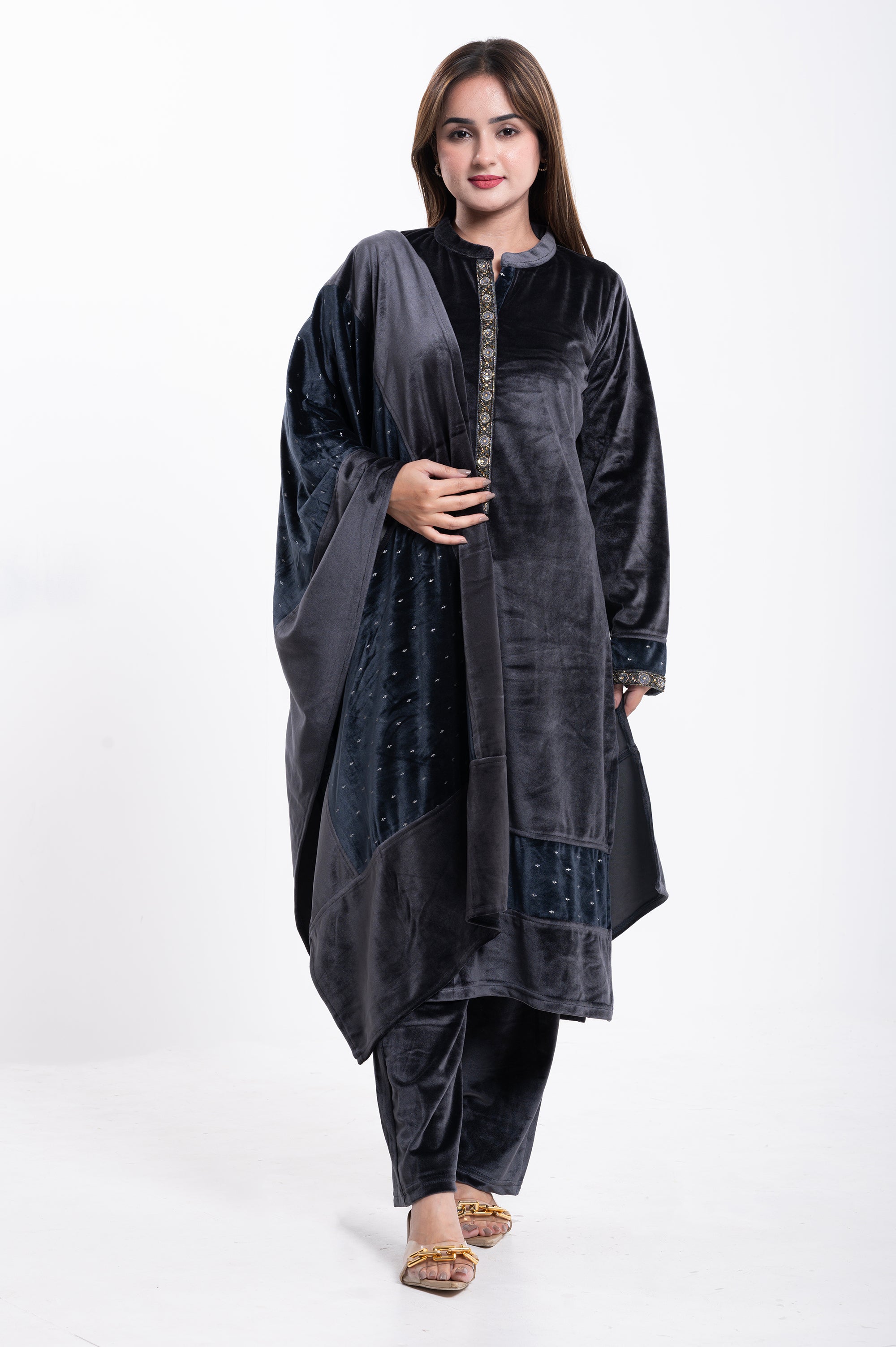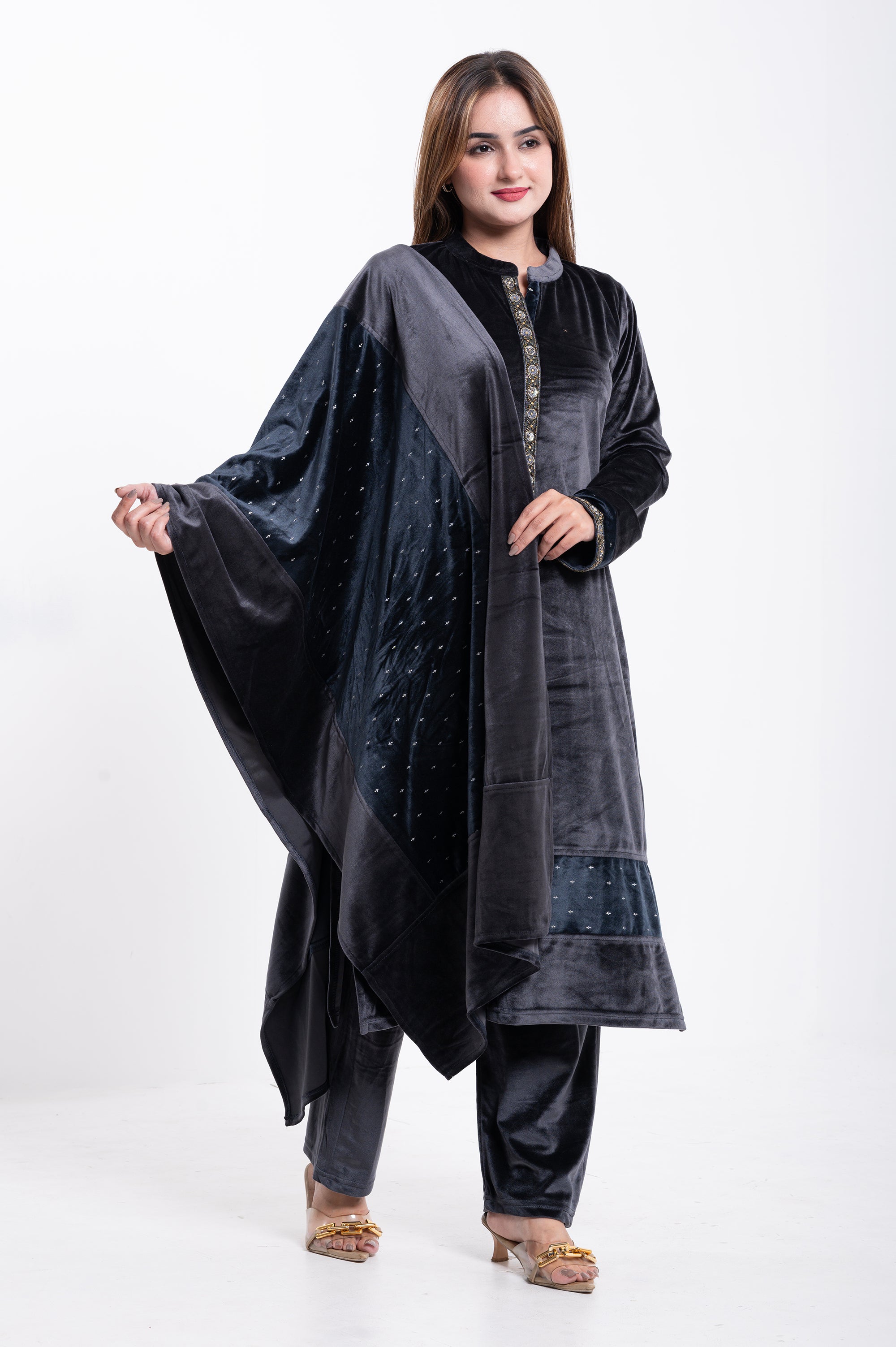 The set includes a straight-cut velvet kameez with detailed embroidery, matching trousers for a sleek finish, and a delicately embroidered dupatta that enhances the overall grace. Perfect for weddings, parties, and celebrations, this attire blends traditional artistry with modern elegance.