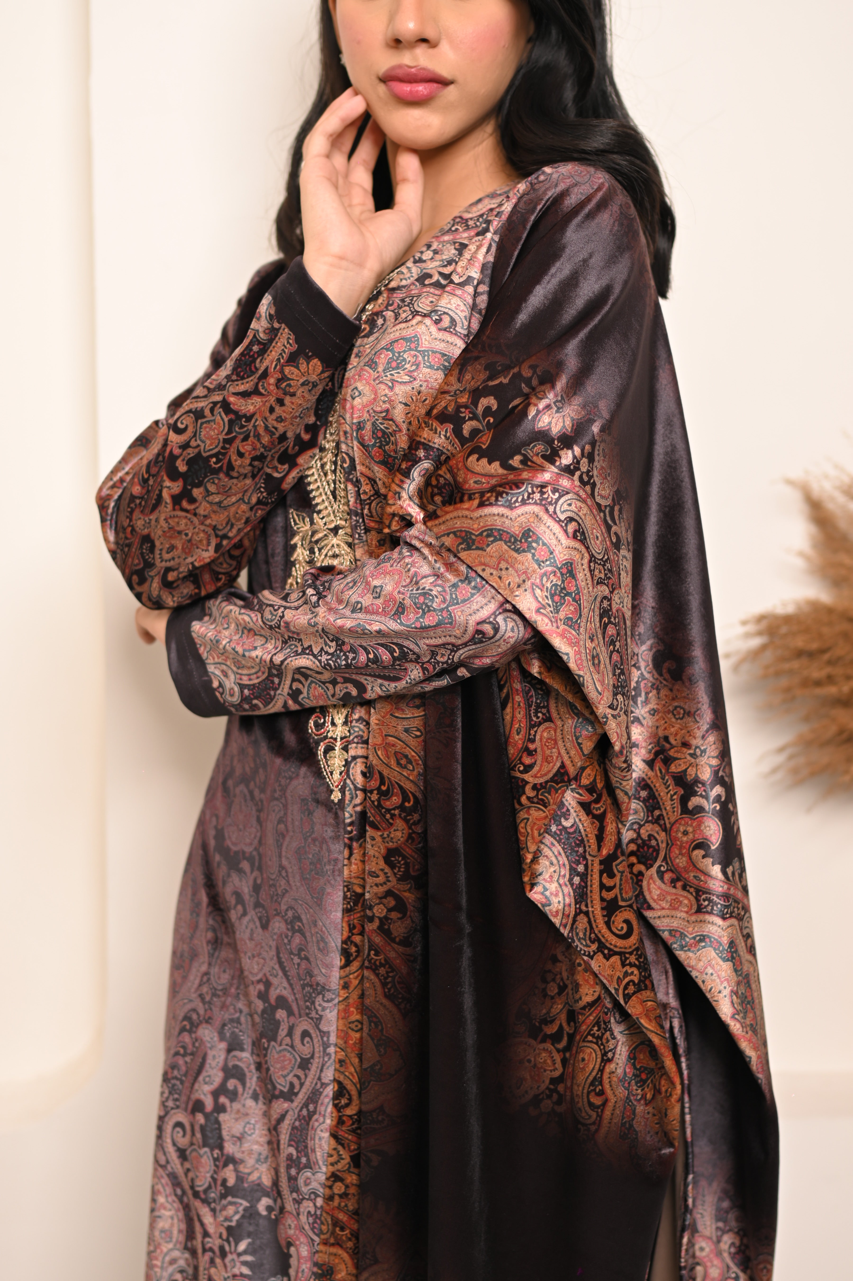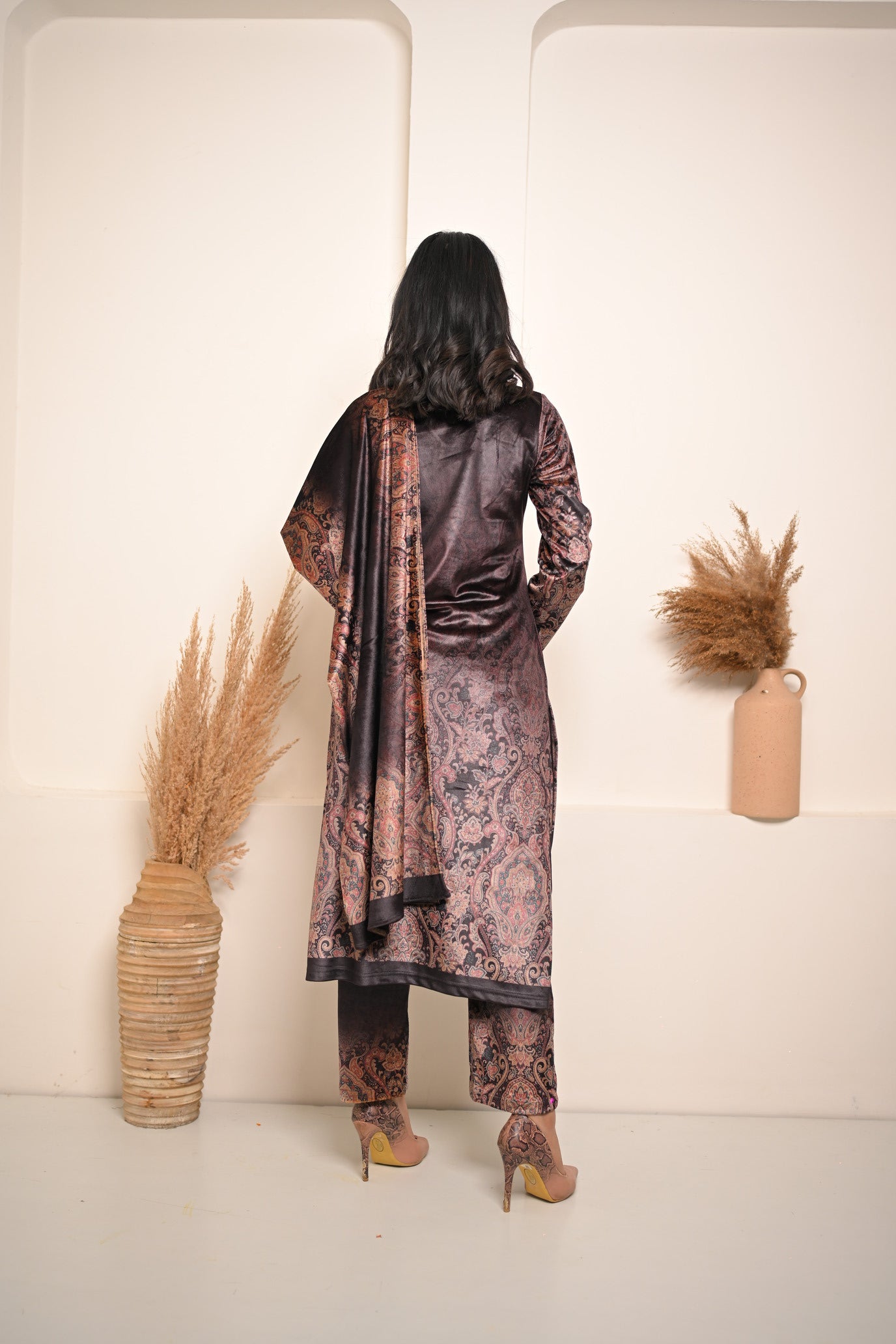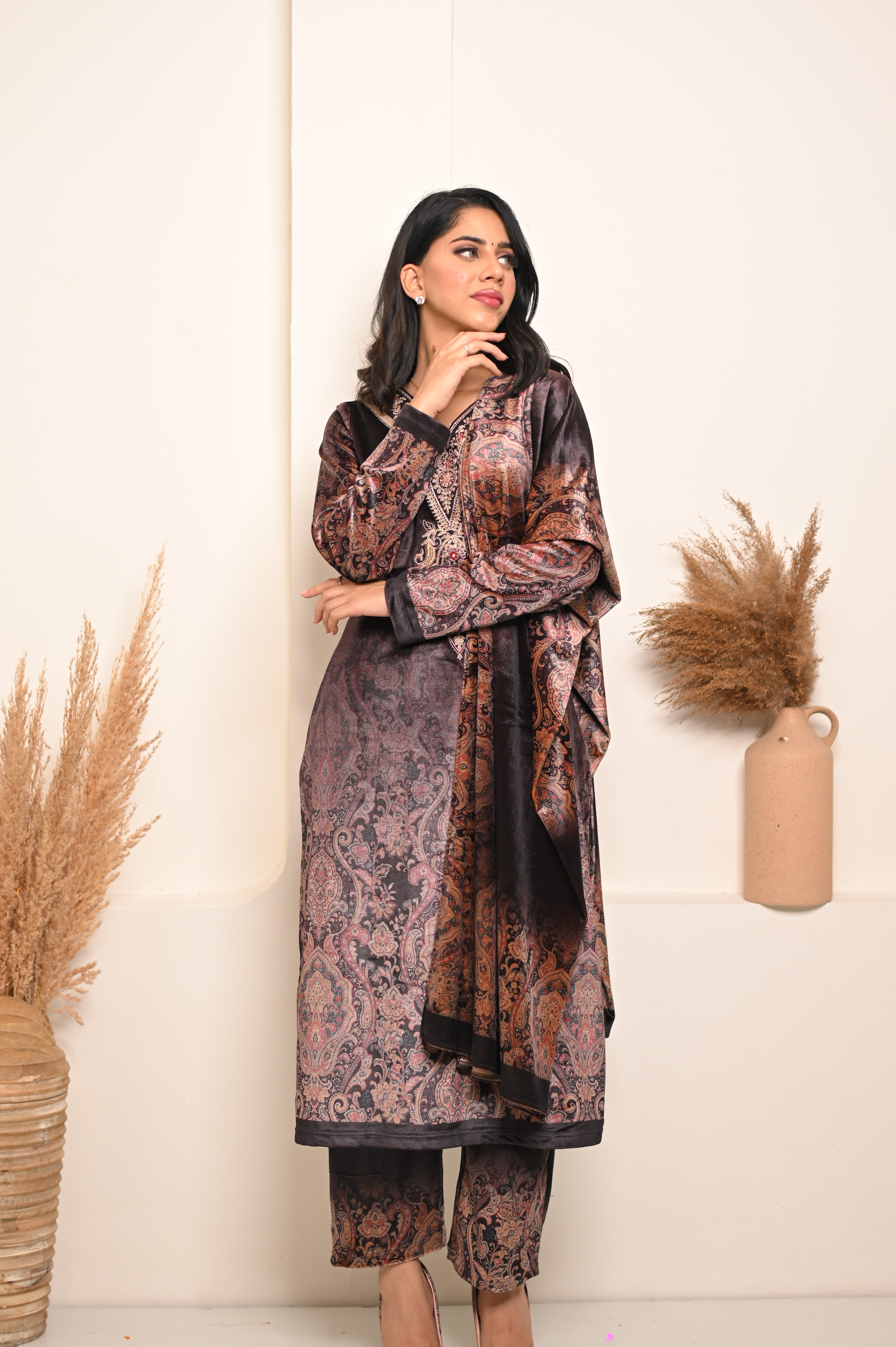 Timeless black velvet suit set featuring exquisite printing, offering a blend of traditional artistry and modern elegance for any discerning wardrobe.