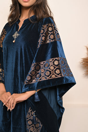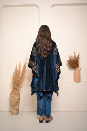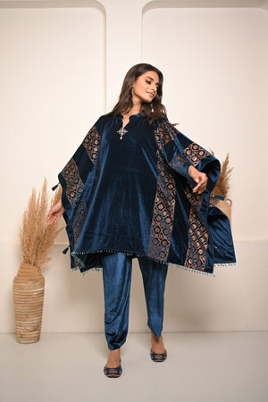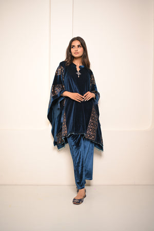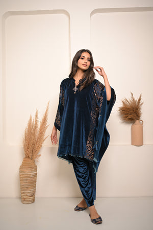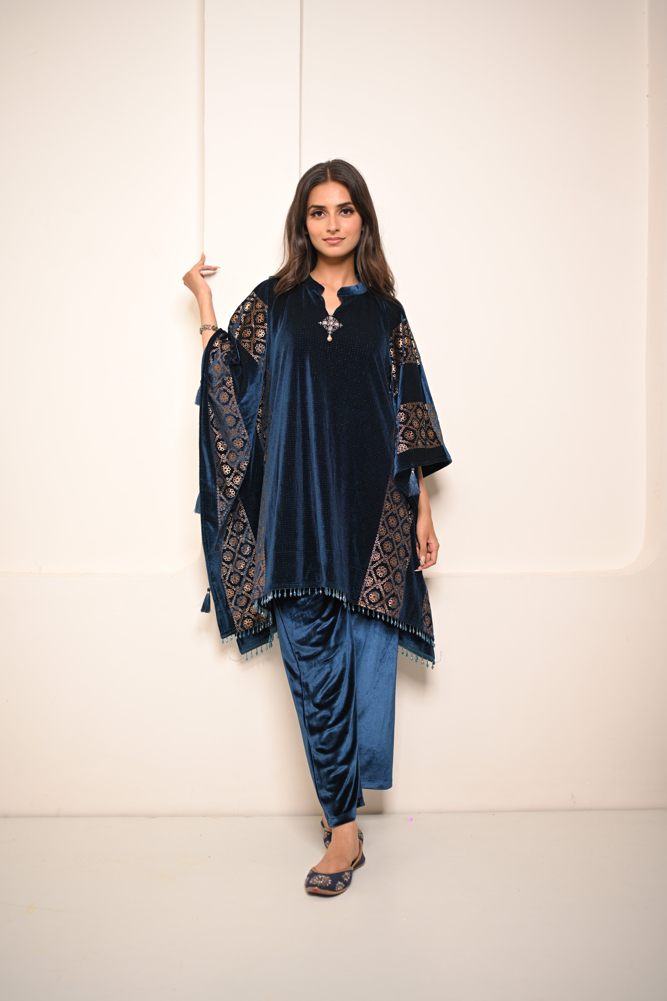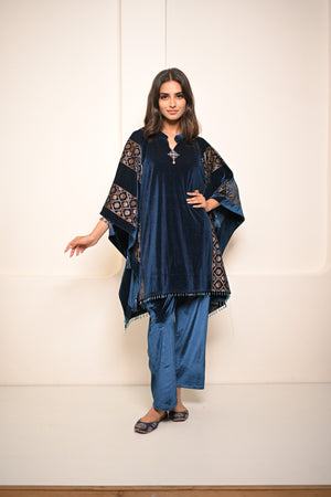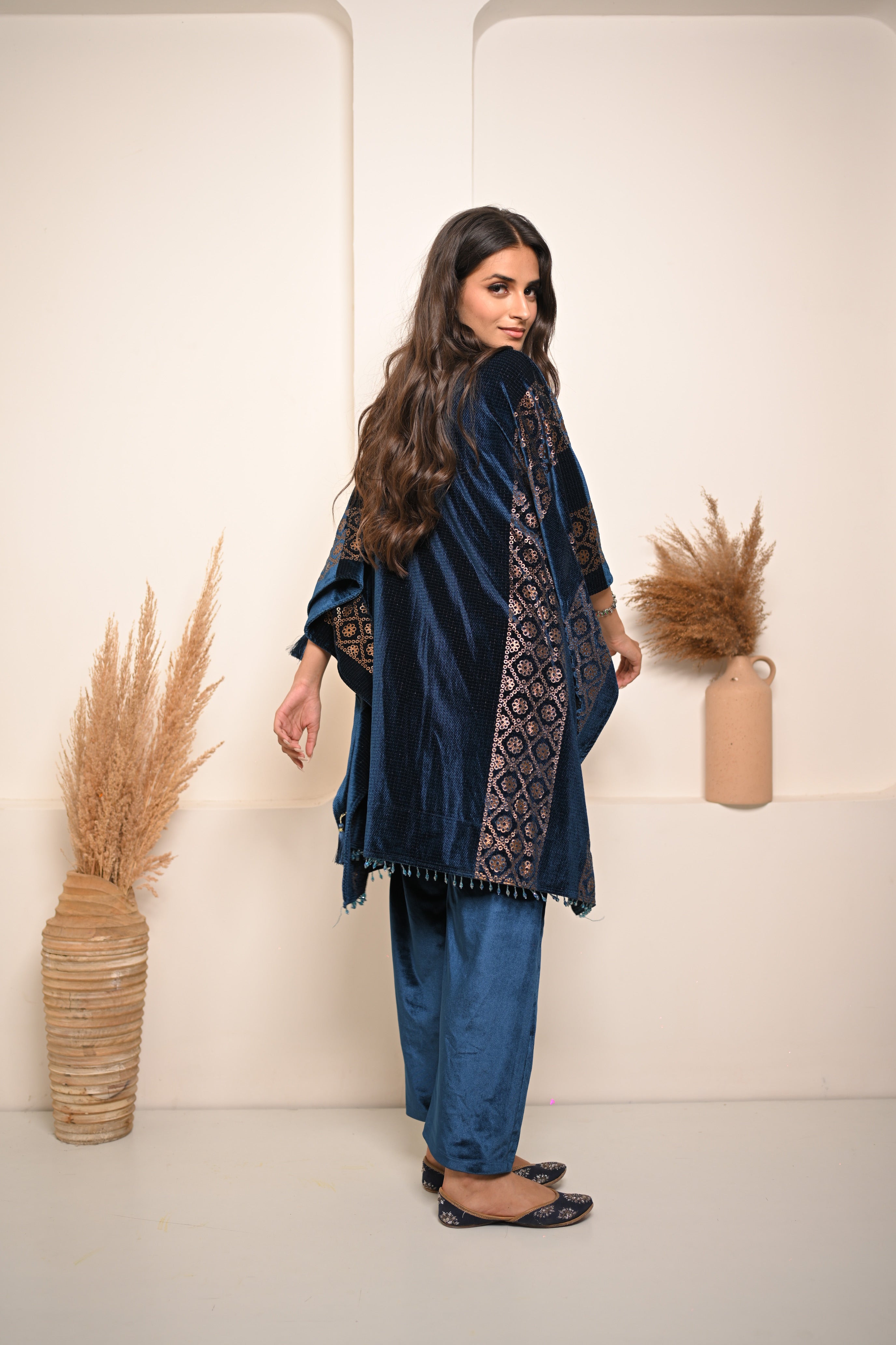 Elegant two-piece co-ord set featuring a luxurious velvet top with front and back prints, paired with a statement accessory for a refined, complete look.