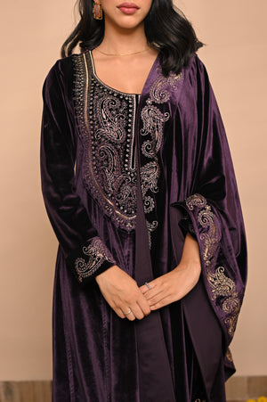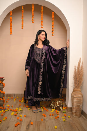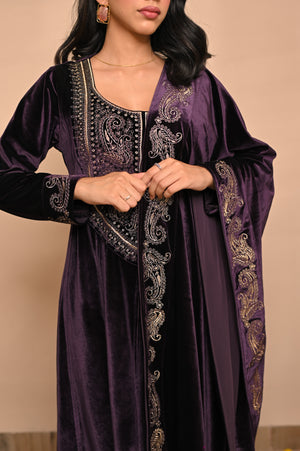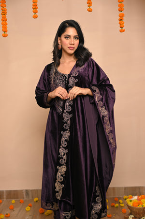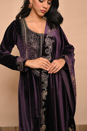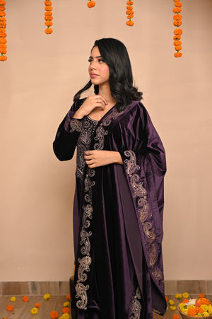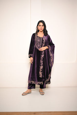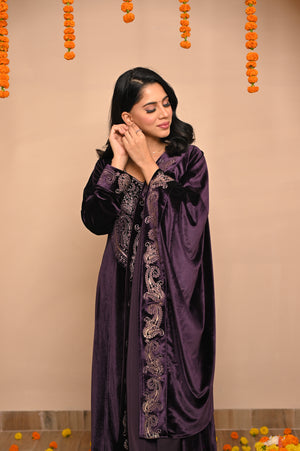 Drenched in the grandeur of jamuni (purple), this Velvet Embroidered Kurta Set redefines winter luxury. With its plush velvet base and intricate hand embroidery, it brings together timeless Indian artistry and royal sophistication — perfect for weddings, winter soirées, and festive nights of elegance.